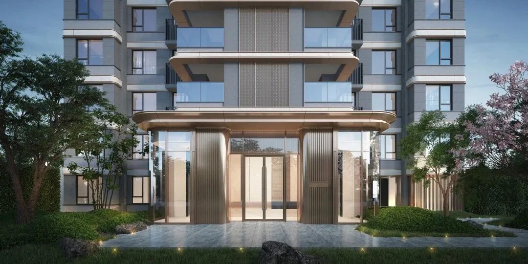 万科城市之光·溪望立面采用米色系真石漆包裹山墙面,深灰色型材勾勒轮廓,金色铝板点缀其间,打造现代化简洁的建筑外立面。