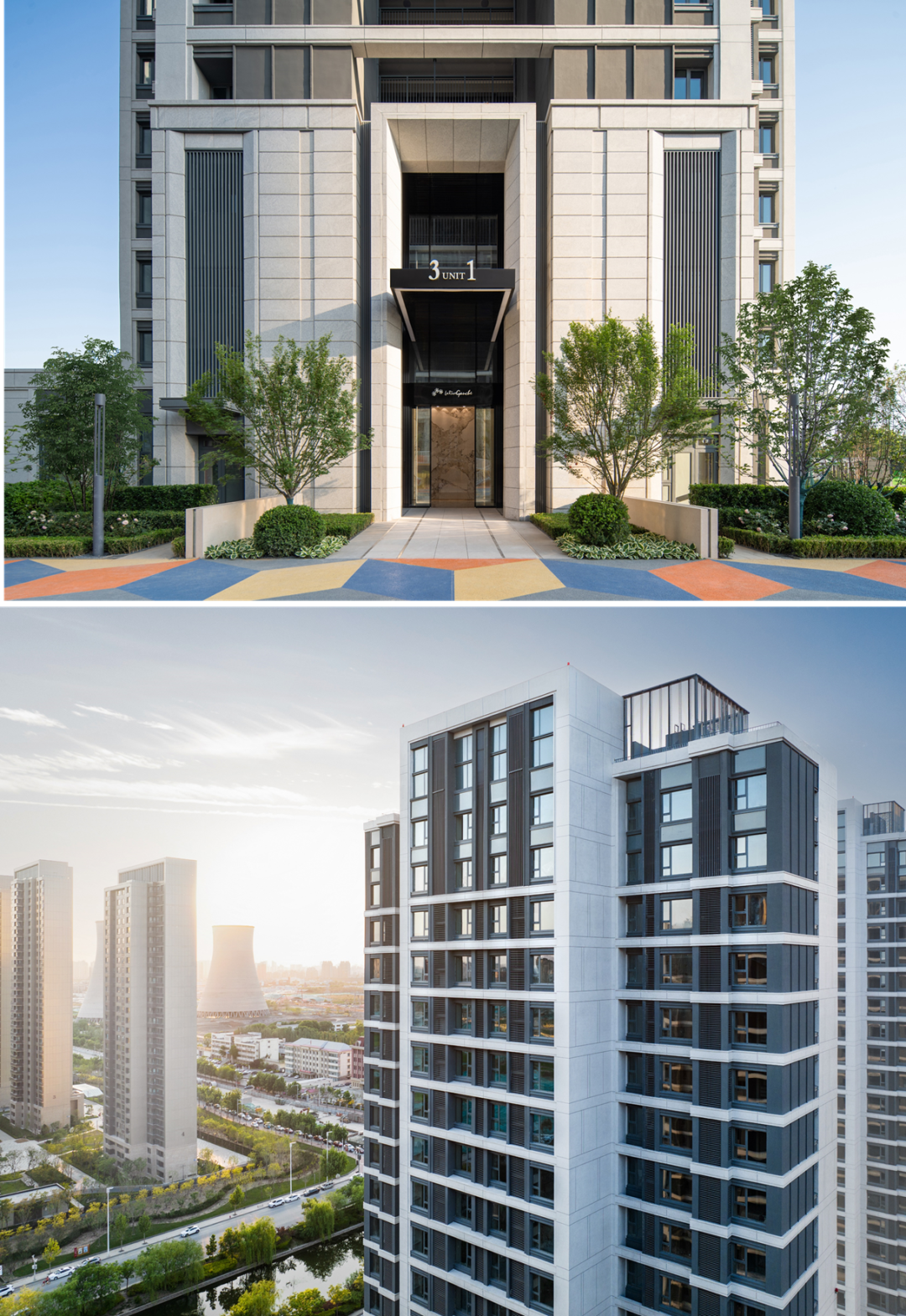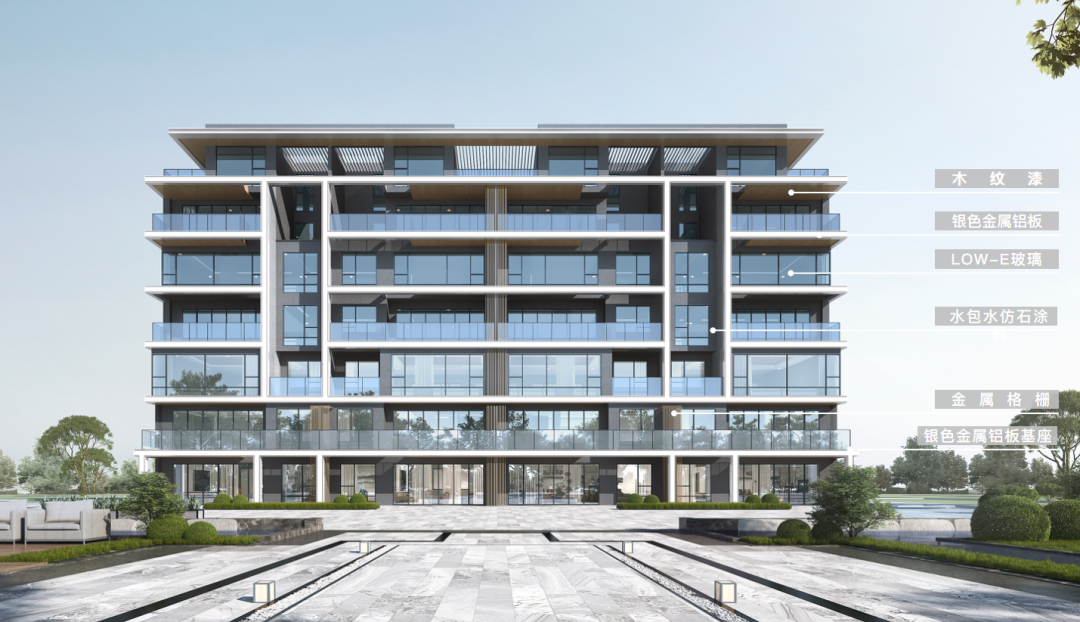 中海左岸澜庭住宅则是基座外墙使用白麻花岗岩搭配灰色铝板,建筑主体以仿白麻真石漆搭配灰色质感涂料为主,提升日常活动中近人尺度范围内的精致感。