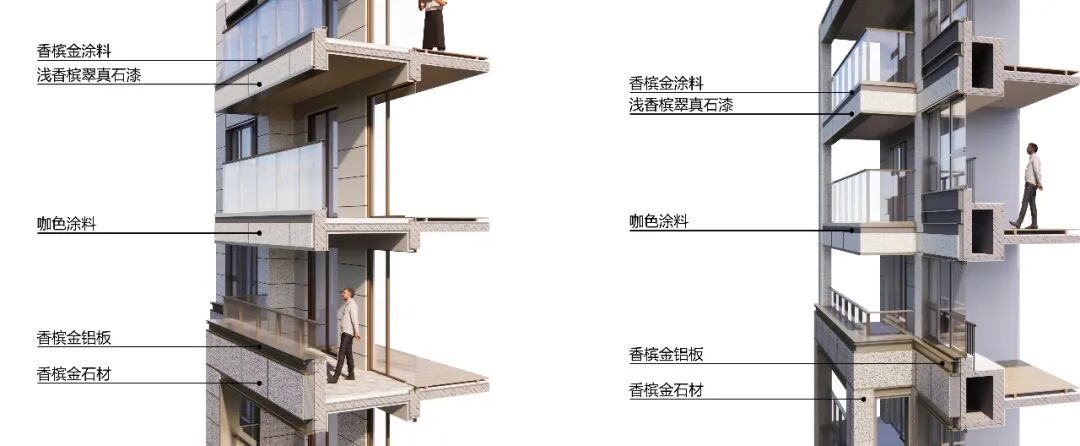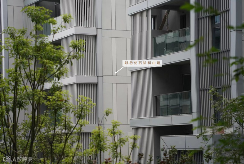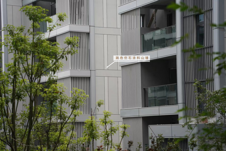 建筑主体墙身距人较远,人眼无法辨识过多细节,采用仿白麻真石漆搭配深灰色涂料可以实现较好的视觉效果。经过不同仿石肌理的挂样对比,结合有韵律的分缝设计,最终实现近乎石材质感的涂料效果。