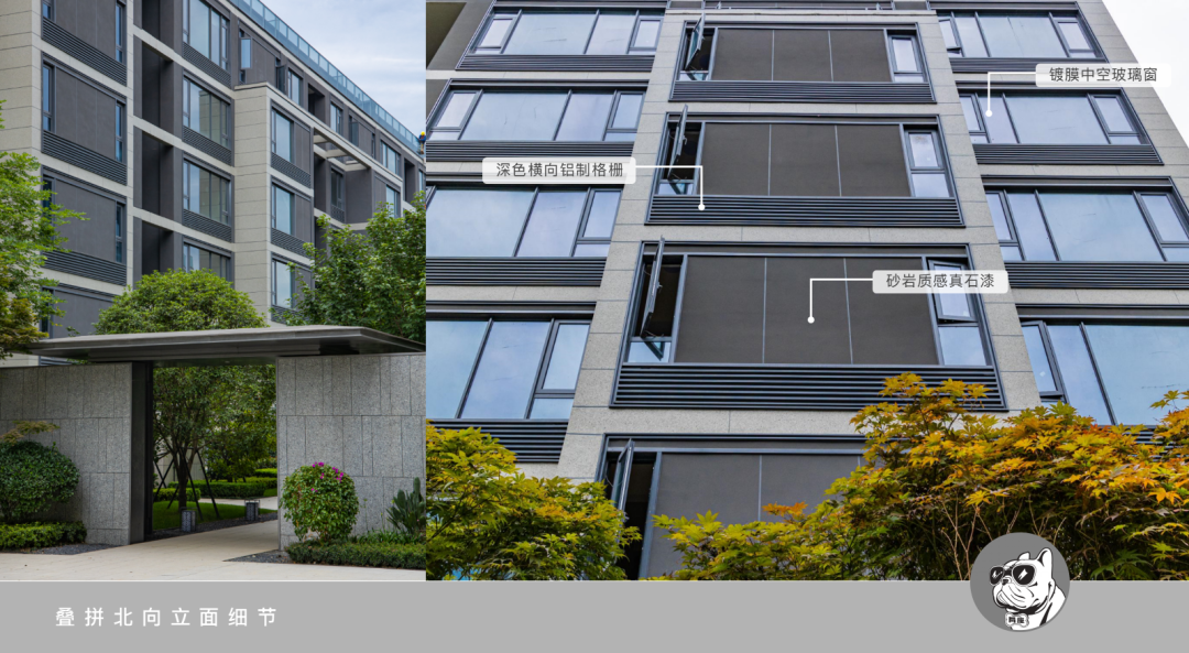 城投绿城·凤起蘭庭在山墙面处理细节满满,深色铝板格栅搭配砂岩质感真石漆、暖色水包水涂料,分缝拉槽,装饰效果极强。