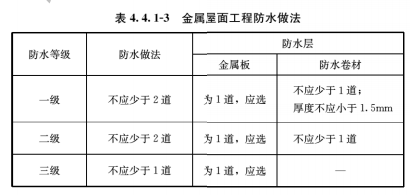 3  金属屋面工程的防水做法应符合表4.4.1-3的规定。全焊接金属板屋面应视为一级防水等级的防水做法。