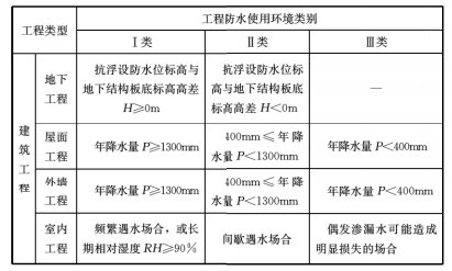 2  二级防水∶Ⅲ类防水使用环境下的甲类工程;Ⅱ类防水使用环境下的乙类工程;Ⅰ类防水使用环境下的丙类工程。