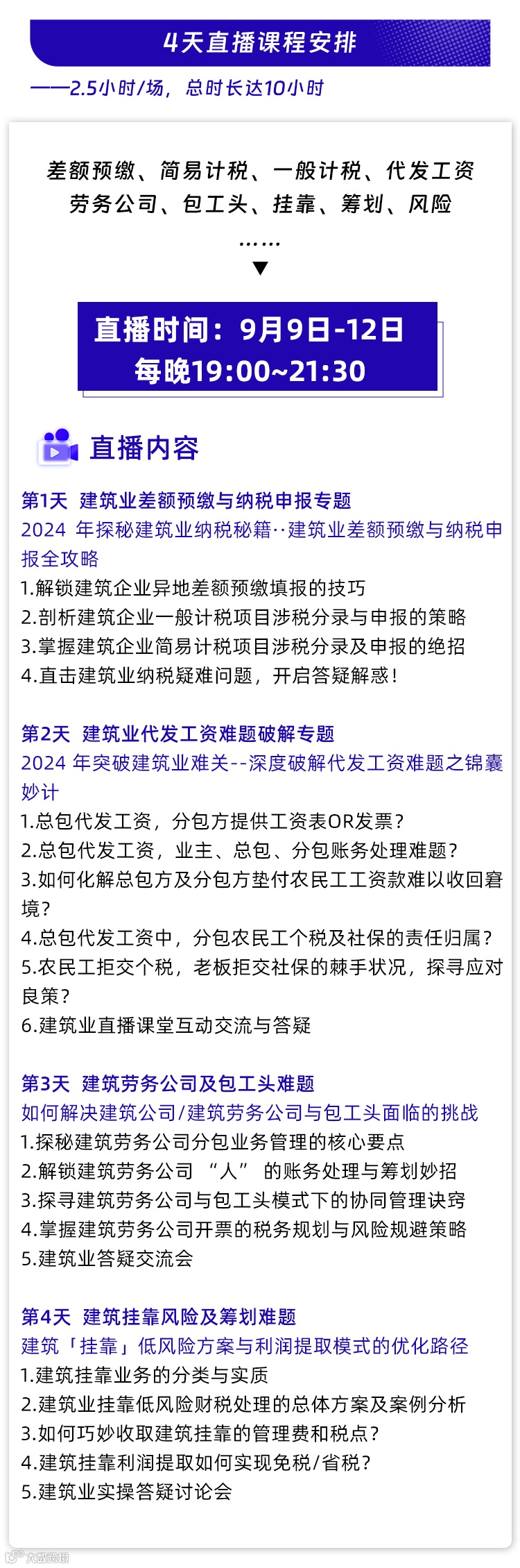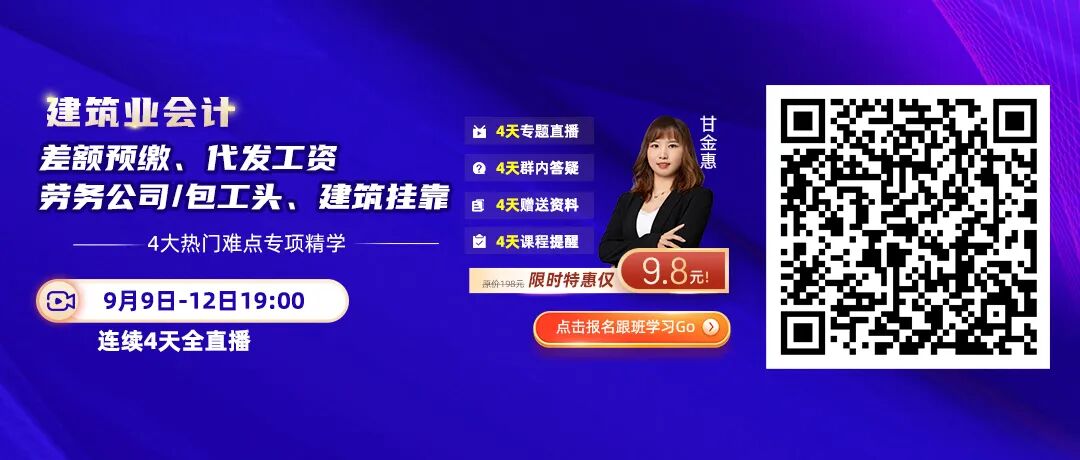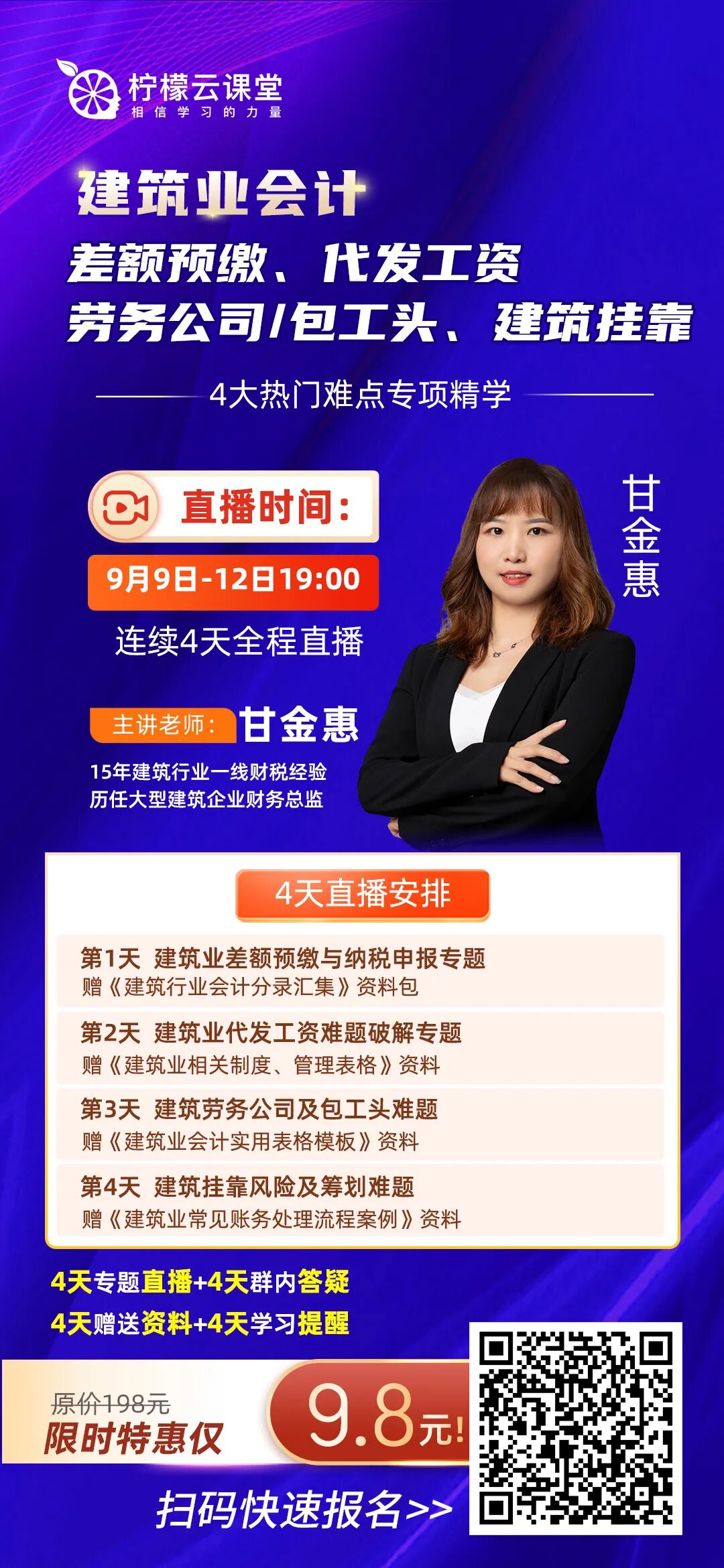 在课上,甘老师将带你深入学习建筑业代发工资等常见疑难处理技巧、建筑劳务公司人、料、票等的处理及一般计税、简易计税等热门申报难题以及挂靠、利润提取等等干货内容!