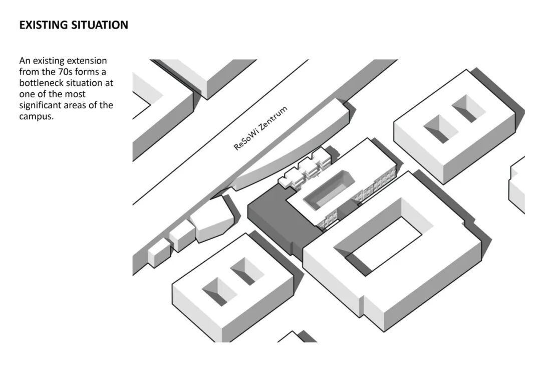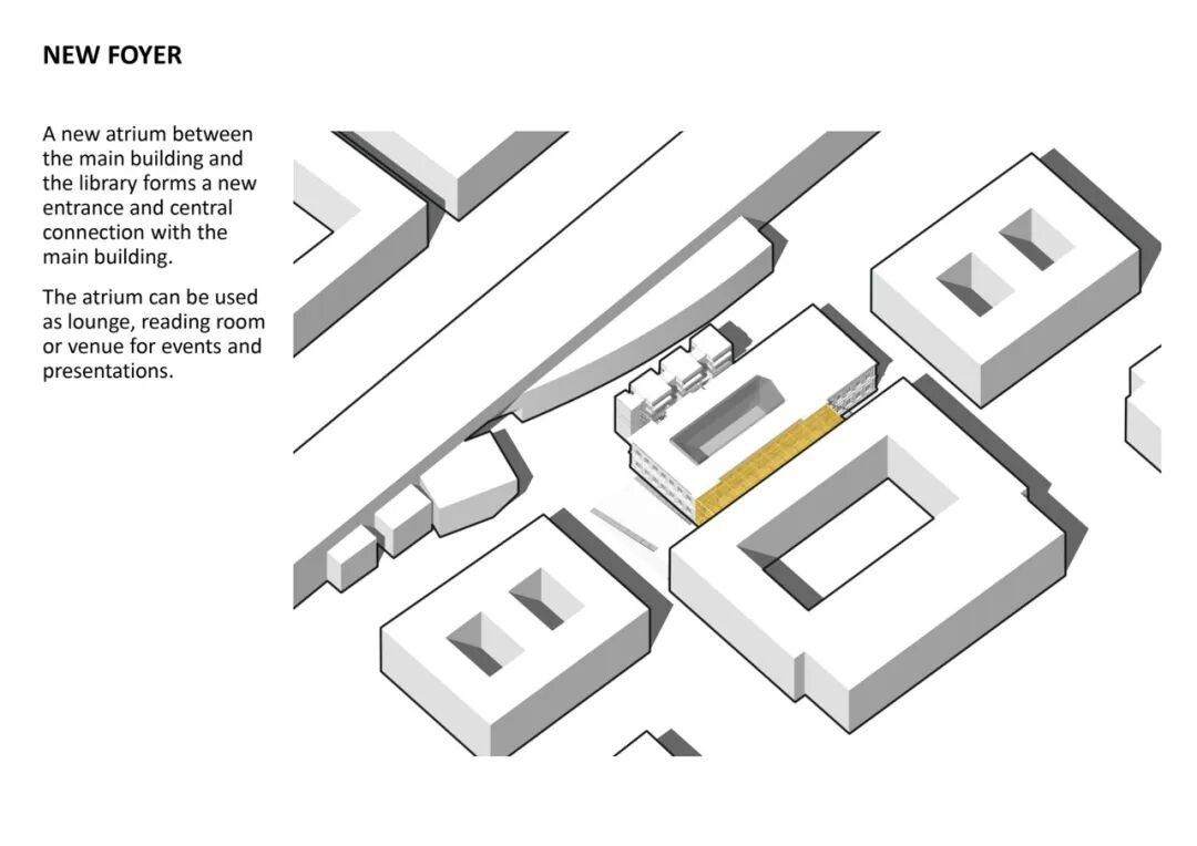 The redesign has given the library a completely new look, characterised predominantly by the two-storey glass-fronted platform that juts out from the top of the historic reading room, originally built in 1895. Demolishing the 1970s-built extension uncovered the historic, listed façade on the north side of the library, which now has a large covered area in front of it. The effect of this – in regard to the urban development of the centre of the en-tire campus – was a major factor in the jury’s decision.