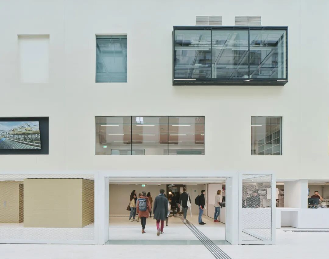 From here, students can also get to the lecture hall and the library service points. They can also access the workstations in the reading room and on the new upper storey provided by the glass platform.
