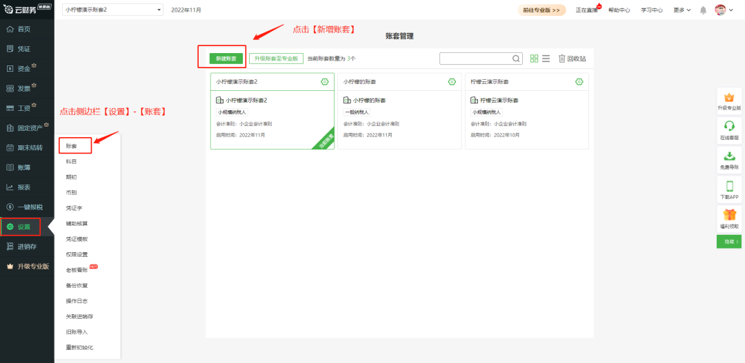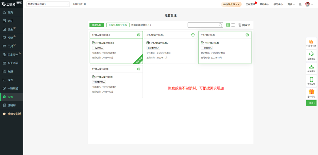 咱们注册柠檬云财务以免费版后,在创建新账套时,系统对会自动开放专业版所有的功能,期限是一个月,可以随时体验;