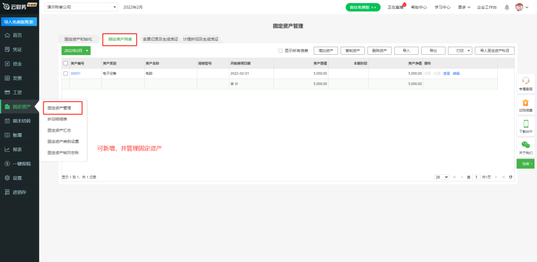 如果你的企业固定资产项目有点多,手工Excel做折旧清单比较麻烦,那就用上专业版的【固定资产】模块: