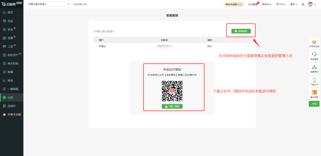 免费版有【老板看账】功能,只需要在软件中录入老板的手机号,他就可以在【老板看账】微信公众号中,去查看他所想要的报表和数据图表;