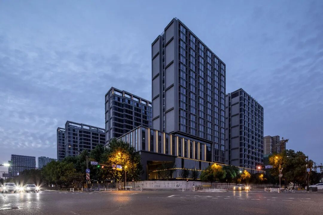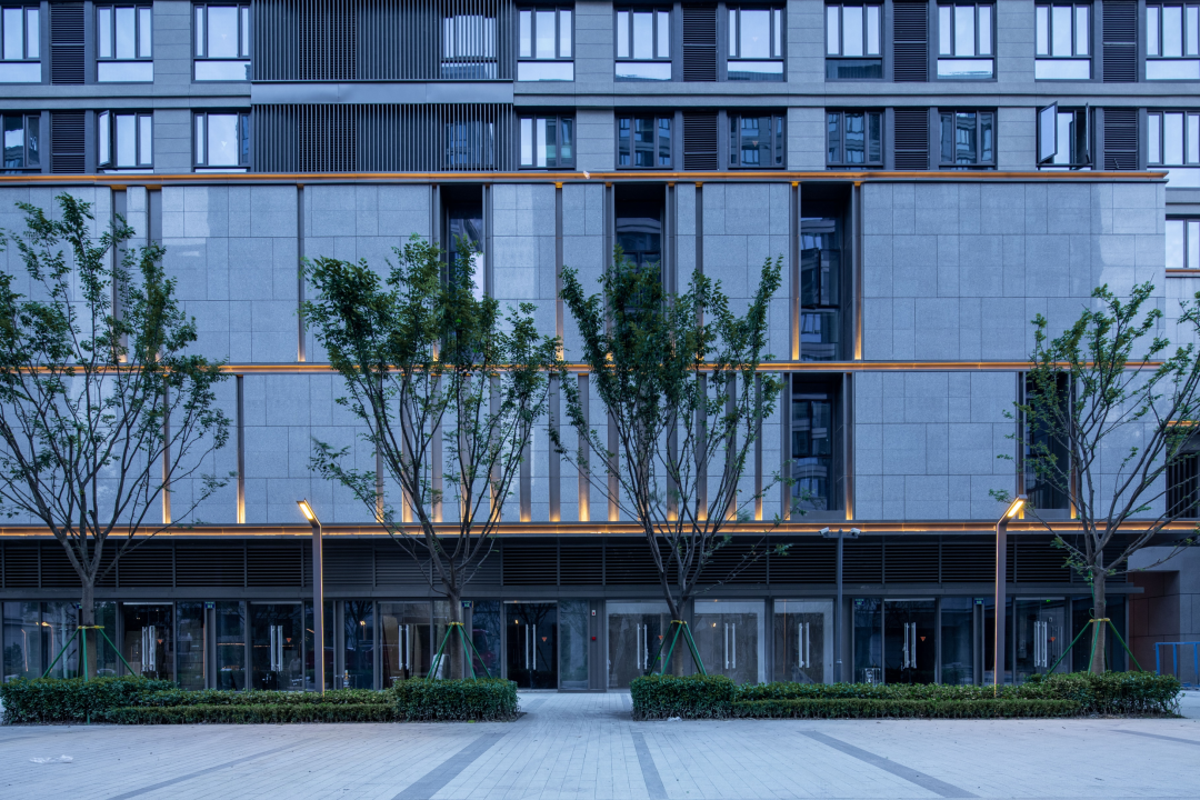 在选材上,大面积的玻璃与石材虚实相生,点缀以金属线条提升立面整体质感。