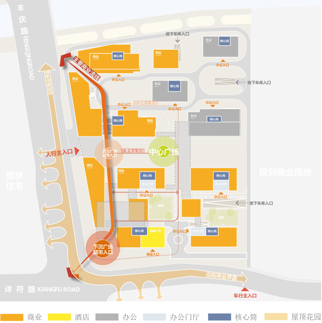 3. 重点区域如入口处设置广场,做标识引导;提供人流汇集的广场空间,促进商业与人流的互动,缓解内部商业空间拥挤感,起到一“收”一“放”的空间作用。