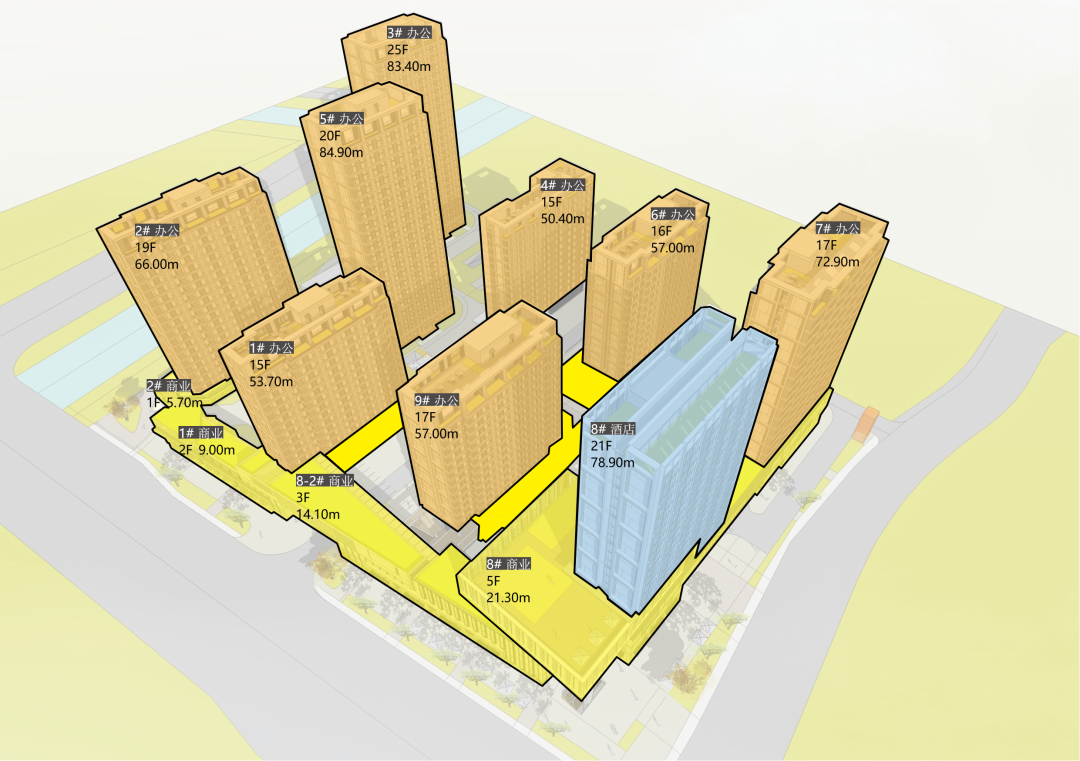 2. 除酒店入口对外直接展示,其他公寓及办公入口均朝内;保证酒店对外的昭示性,同时到达酒店的可达性最优,内部的花园空间提高了公寓及办公的出入体验,增强场地与建筑功能的联系。