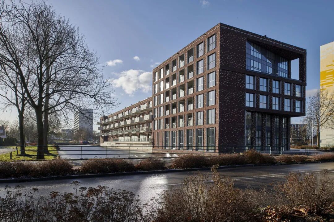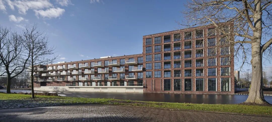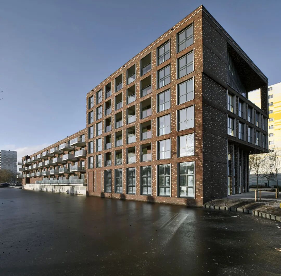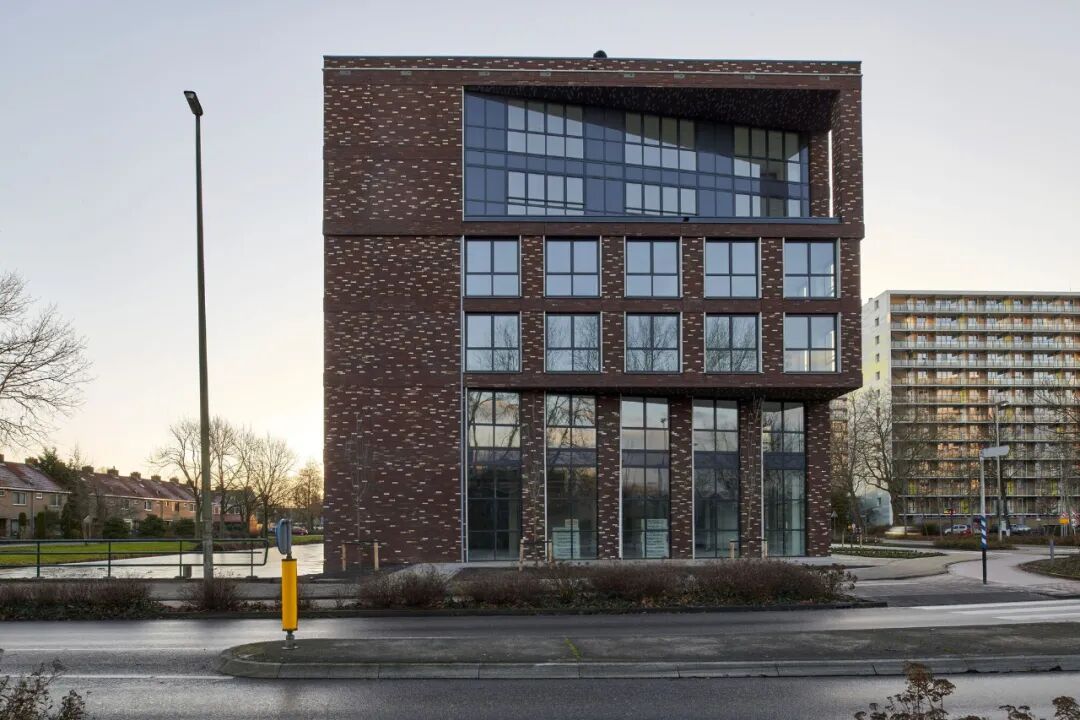 Architecture. A building with an expressive head looks into the distance with optimism and energyA double floor height with alternating open and closed façade sections makes room for the residents' welcome hall. The sleek brick facade in combination with the large windows gives Wheerlicht a tough and friendly appearance. With the special detailing of white concrete elements in the windows, the perspective in the architecture is enhanced and is created in the facade with light and shadow.