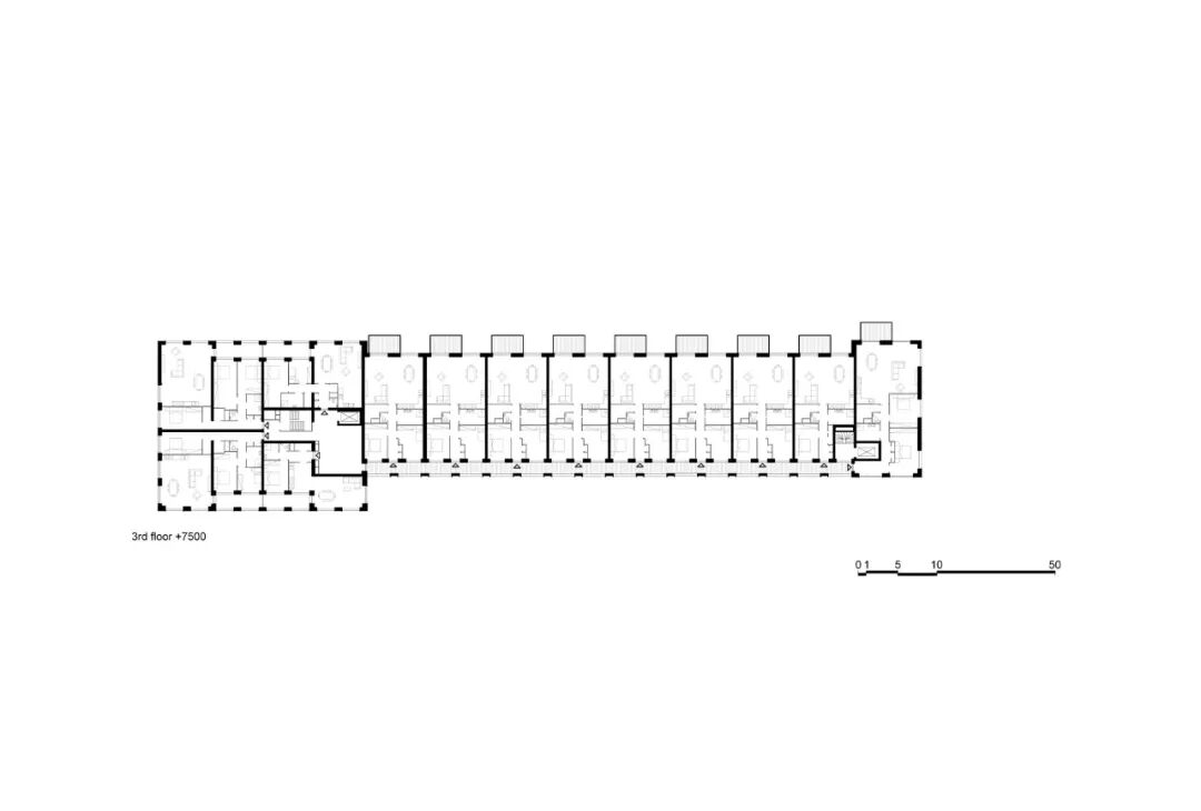 建筑。一座具有表现力的建筑带着乐观和活力向远方眺望。双层高度的开放和封闭的立面部分交替出现,为居民的欢迎大厅提供了空间。光滑的砖块外墙与大窗户相结合,使Wheerlicht的外观坚韧而友好。通过窗户上白色混凝土元素的特殊细节处理,建筑中的透视效果得到了加强,并在立面上形成了光和影。