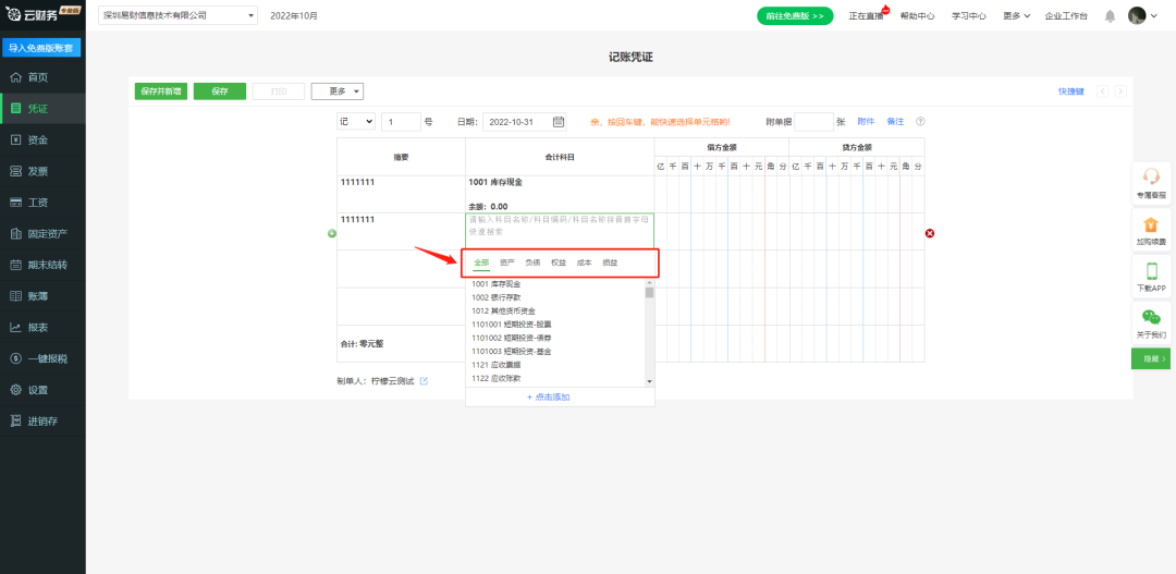 新增凭证选择科目时增加科目类别选择,让财务人员可以通过科目类别快速找到对应的科目