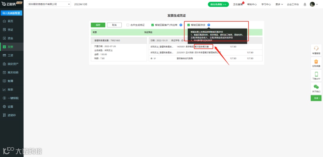 发票生成凭证可智能匹配存货、可自动携带附件数和数量单价。销项发票、进项发票生成凭证时增加了【智能匹配存货】的选项,软件会自动按发票明细上的商品名称+规格型号精准匹配辅助核算-存货的存货名称和规格型号(使用存货辅助核算)或科目名称(未使用辅助核算)