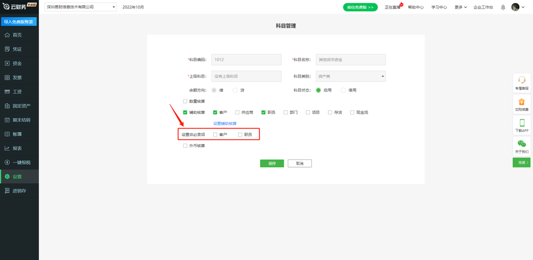 科目使用辅助核算时可设置非必录项,设置非必录项后录入凭证时可不录入非必录的辅助核算类别。