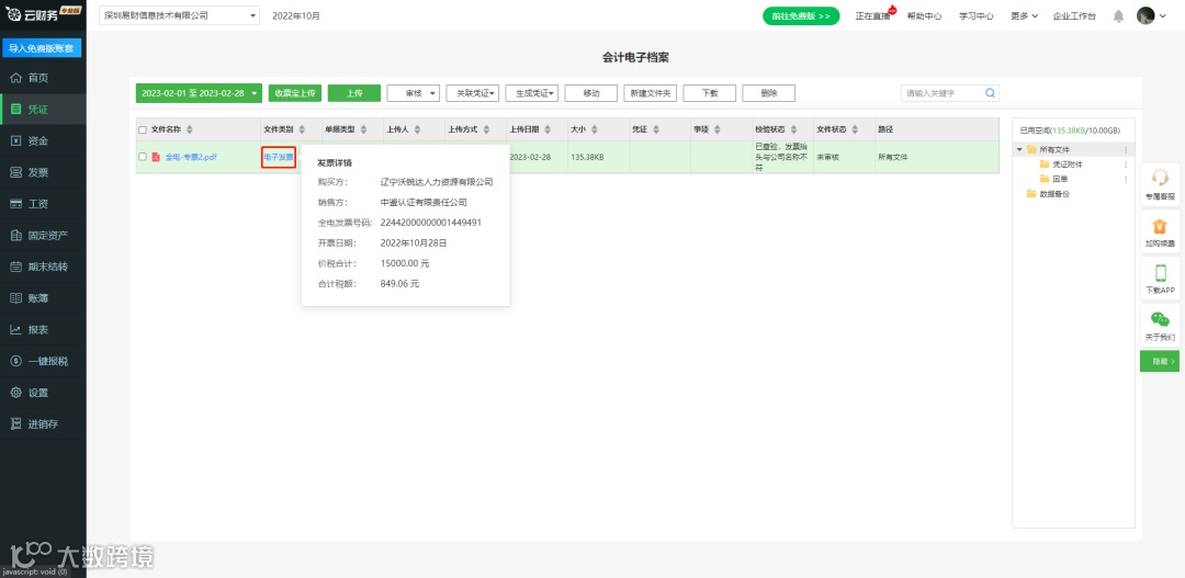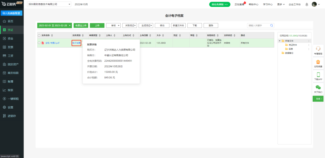 会计电子档案支持显示电子发票的详情,用户在会计电子档案就能快速查看电子发票的详情信息。