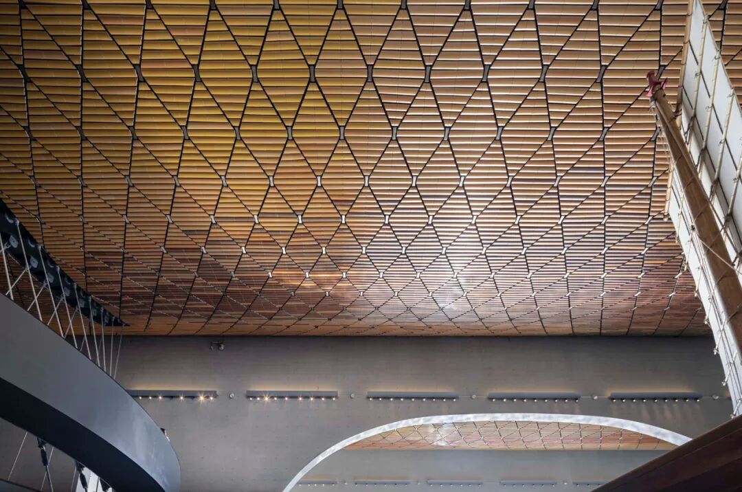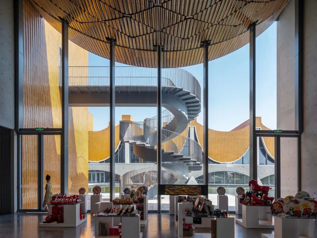 The selection of main building materials emphasizes the principle of locality, i.e. "made in Luoyang". A large number of indoor and outdoor uses of the improved Luoyang three-color ceramic cladding, which better alleviates the alienation caused by the fair-faced concrete buildings and the defects in the internal space acoustics. Among them, the ceiling "Yunfan" is the world's largest ceramic ceiling artwork composed of 126986 three-color ceramic units.