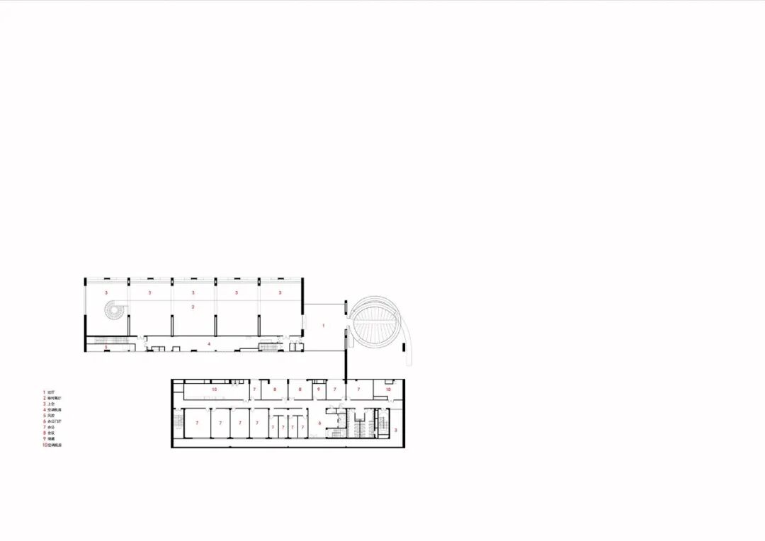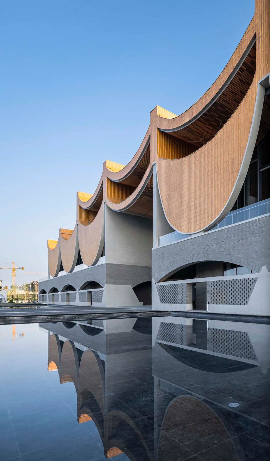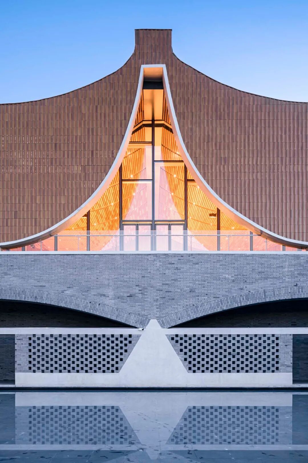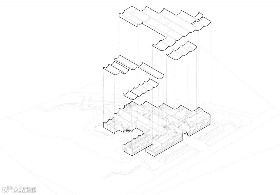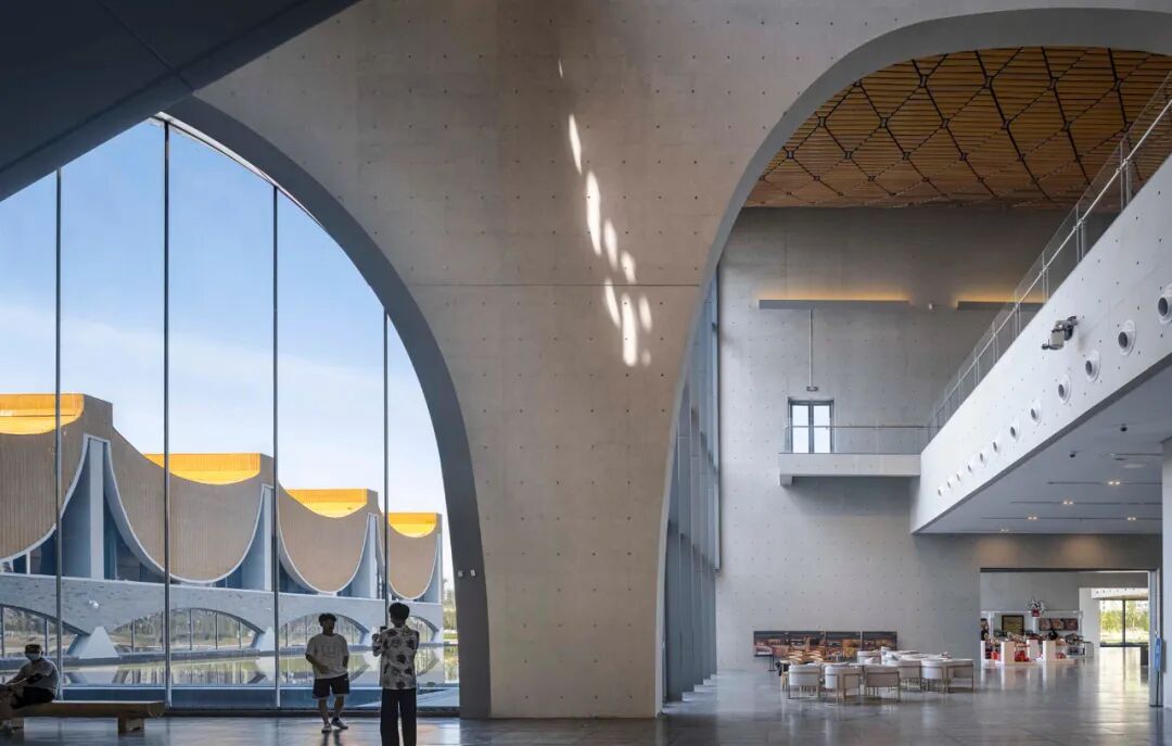 Dual application of structure: in the plane organization, the arch shear wall with transverse and longitudinal interweaving is adapted to form an effective two-way seismic structure system. In the section organization, the upper roof adopts prestressed concrete suspension plate & end concrete "Tang Dynasty tile" and the arched shear wall of the lower base to form a closed shear wall force transmission system. The structural features of plane duality form a clear indoor space structure through the pouring of fair-faced concrete with large formwork, while the structural relationship of section duality endows specific historical memory and cultural connotation through the combination of ceramic and blue brick materials.