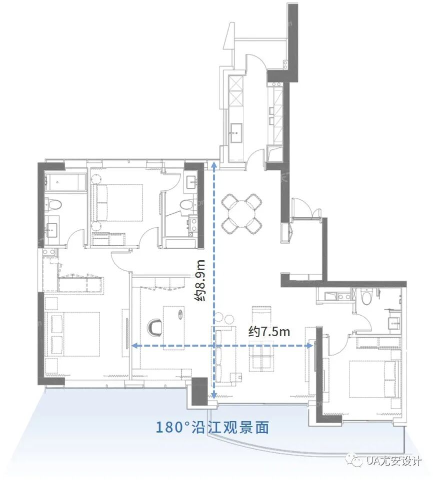 为实现景观最优化,项目在楼王产品设计中设置突破式的尺度与视野,为居住者提供更具奢阔感受的情景交融。以195㎡产品为例,为最大化沿江观景面优势,产品设置面江4面宽的奢阔尺度,客厅与书房构成约7.5m×8.9m的超大宽厅,并拥有双梯入户的仪式感与南向沿江180度的超尺度景观面。