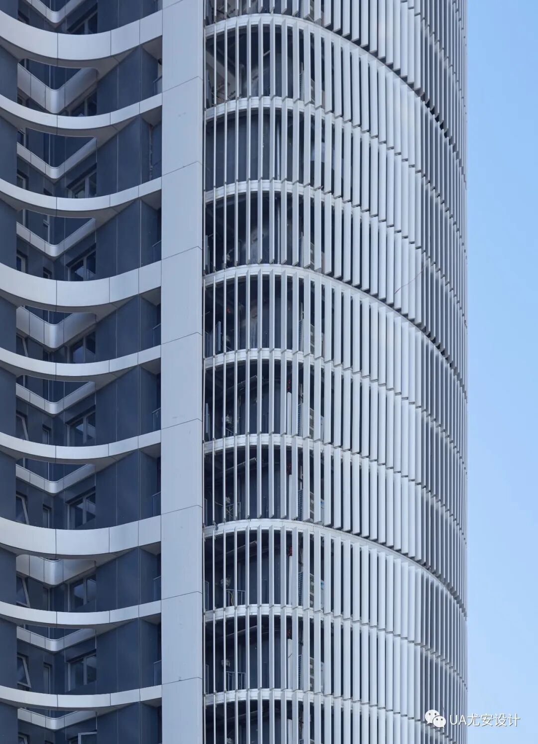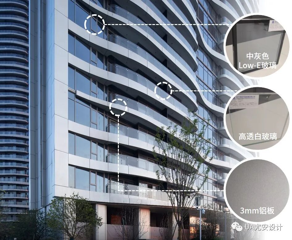 作为武汉城市名片,项目需呈现更契合CBD气质的优雅公建化立面,考虑到住宅建筑规范要求,经过与幕墙顾问RFR的研讨,立面设计确定南北一体化设计的类幕墙式窗墙体系,通过栏板玻璃材质、飘带铝板材质及涂料搭配的选材方案,最终呈现具有独特记忆点的公建化立面落地效果。