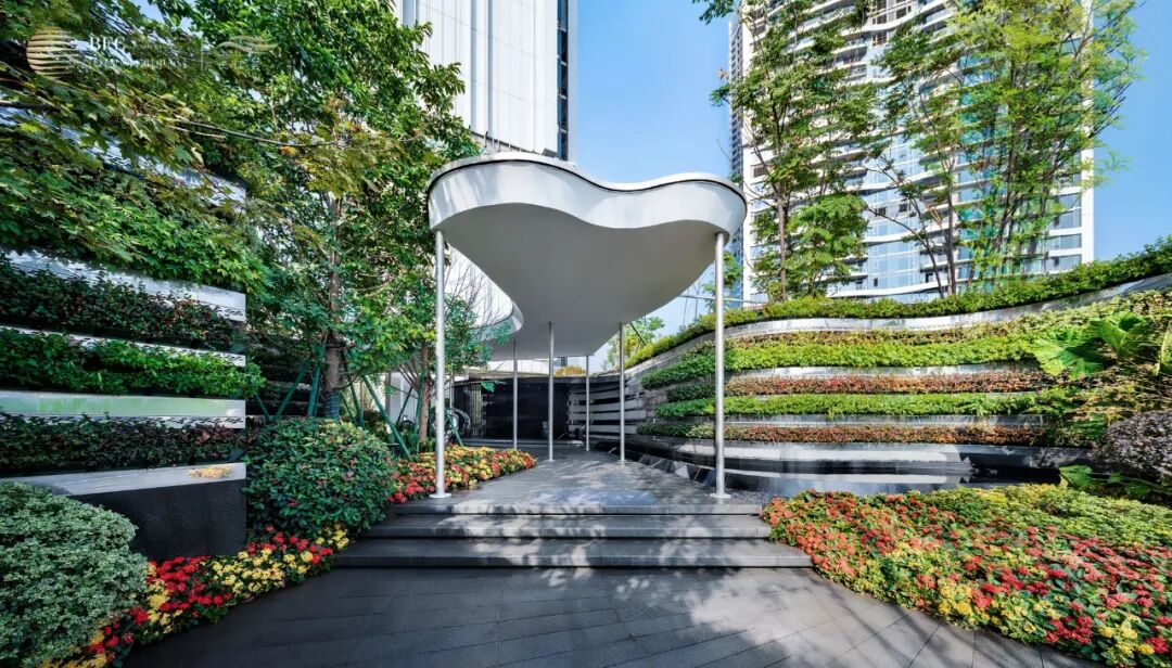 设计对归家动线上的重点部位进行全模全场景的推敲,通过立体景观的处理手法,在集约地块中实现了丰富的景观体验。步入式的风雨连廊轻盈通透,令归家具有度假般的体验感,并与单元大堂紧密结合,形成便利的一体化设计。单元大堂入口优雅,体现近人尺度的陌生感和未来感,架空层则采用建筑景观一体化设计,模糊室内外界限,令使用者充分感受室内外景观的联动。