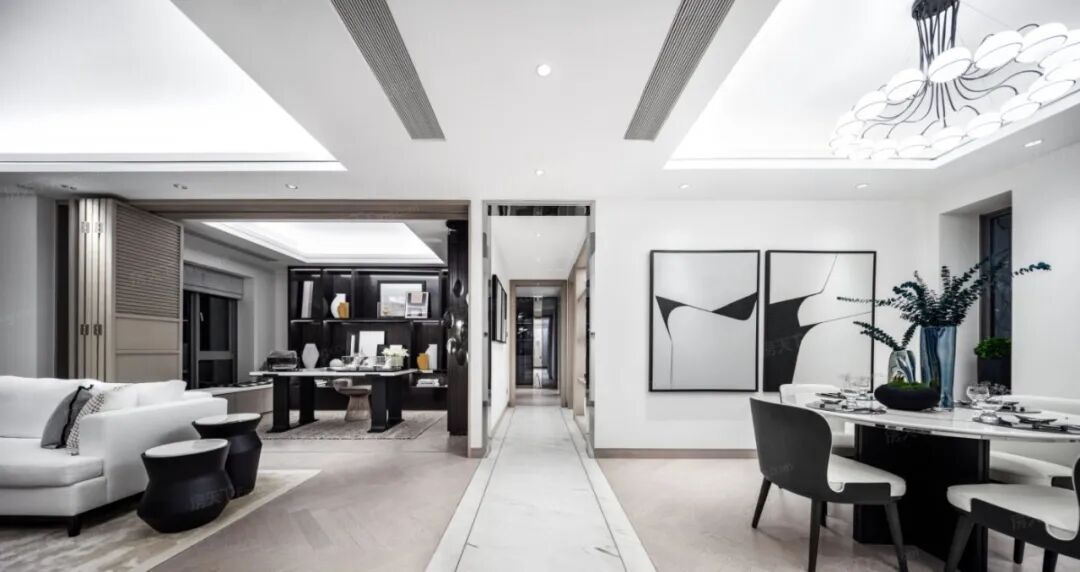 为实现最优的入户体验感,入户大堂模块设置了四级空间体验,设置面积150㎡、高度6m的四层挑高大堂,以景观艺术廊过渡,形成由单元入户雨棚灰空间—挑高接待大堂—景观艺术长廊—分户私属侯梯厅所构成的回家场所感。