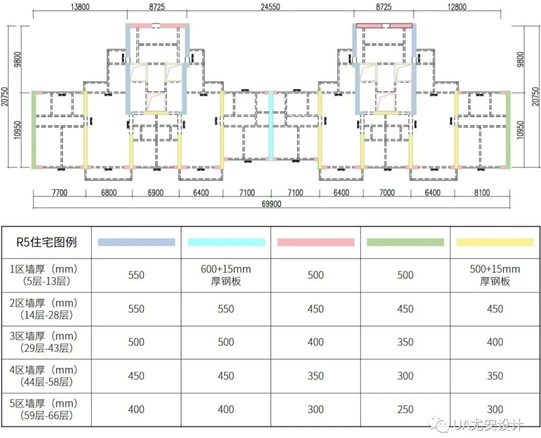 在超高层住宅的设计中,如何平衡核心筒结构与使用体验品质是一大难题,需要在保证经济、合理、安全的同时,避免因结构墙过厚而降低产品的舒适性。设计将原概念方案中采用框架-核心筒的结构体系,结构墙厚需800mm以上的结构进行优化,通过增加核心筒的纵向净深和刚度降低建筑的高宽比,将结构墙厚度控制在了600mm以内,令户型实现薄板化,更具舒适感。