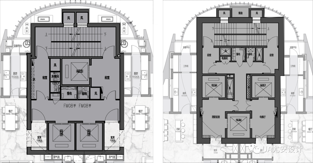 结合规范要求与核心筒方案比选,产品方案采用中小户型使用双电梯厅、大户型使用三电梯厅的组合,在空间构成上实现管井集约的布置。