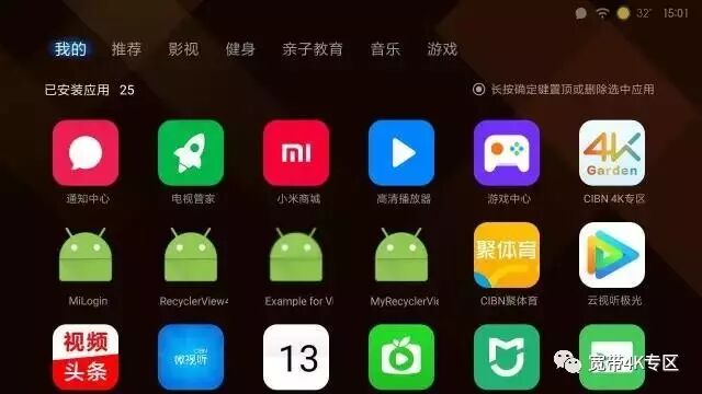 1. 关注4K花园微信公众号,点击菜单栏APP下载,并在电视上安装;