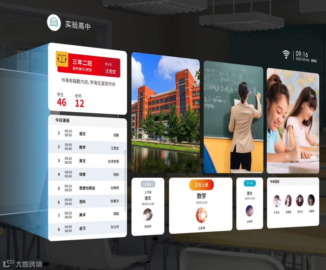 在应用于各教室门口时,班牌可支持学生走班课堂实时打卡签到,实时反馈请假、迟到、未到等考勤数据,便于教务人员清晰知晓当日各班级到校情况及离校情况。同时,结合教育管理场景,电子班牌还提供新闻列表、相册轮播、学生课表等多种模板方案和辅助功能,可展示班级通知、班级动态、班级课表、班级相册、班级荣誉、值日生、倒计时等多种信息,便捷展示班级文化特色,满足班级个性化需求。