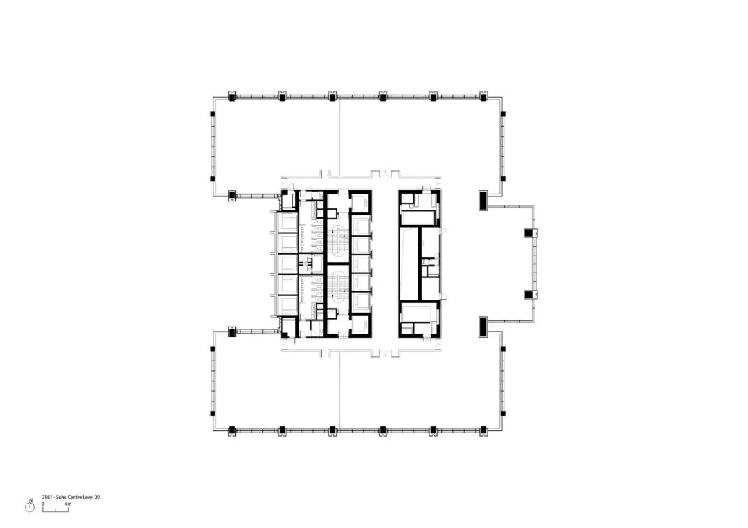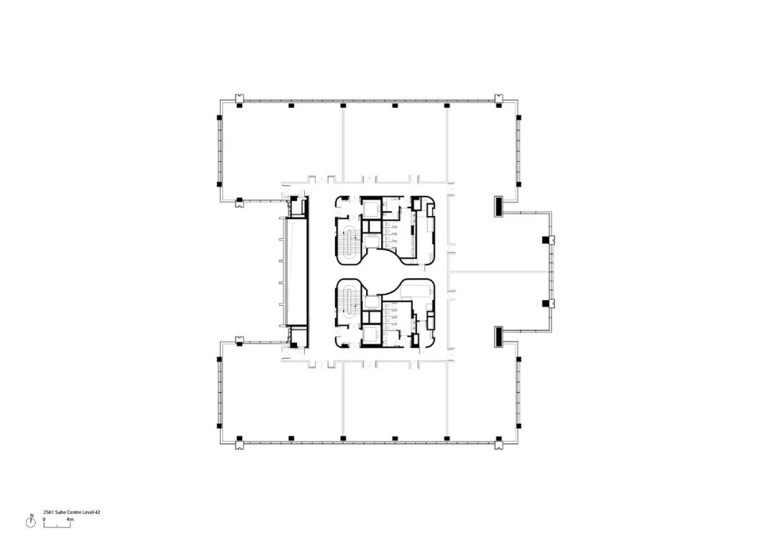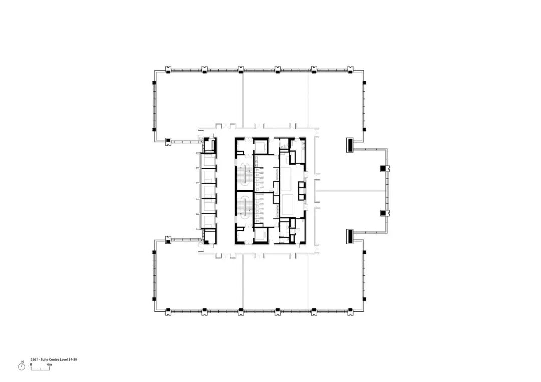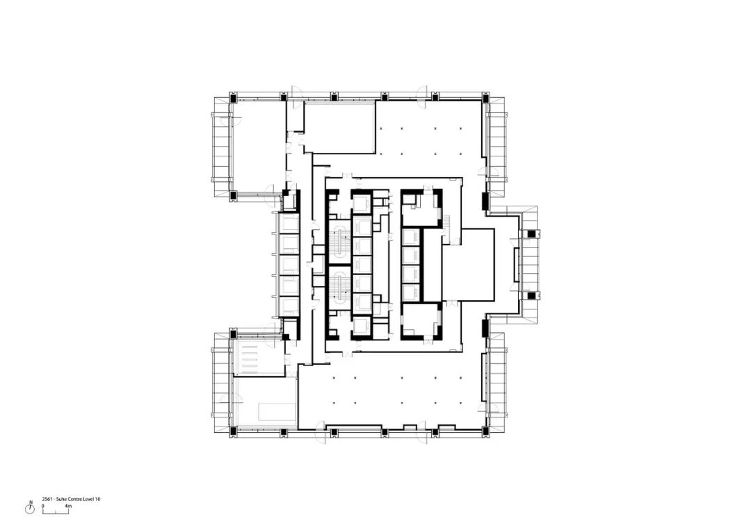 无柱、灵活的办公室楼板被设计为适合各种布局,从单一到多个租户。每一层都有可拆卸的楼板,以便在它们之间进行连接。沿着西面的立面,建筑的中间部分是凹陷的,让自然光照射到办公空间,一排风景电梯位于这个凹陷处,以最大限度地扩大公园和河流的视野。