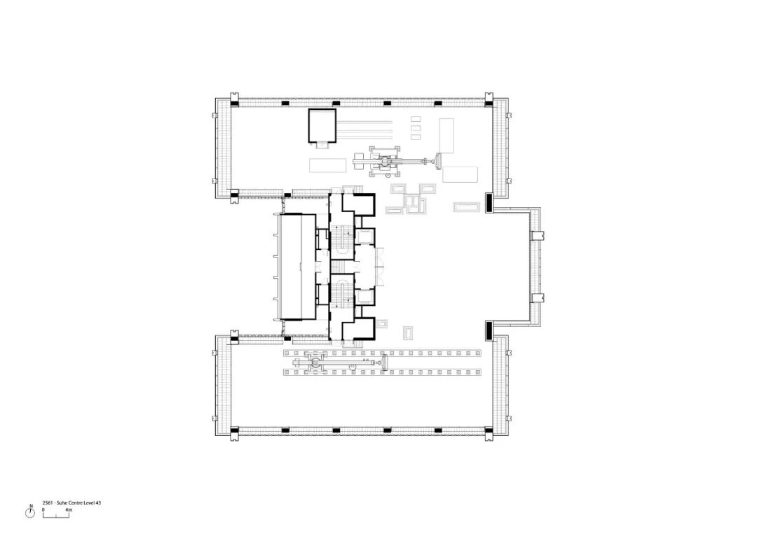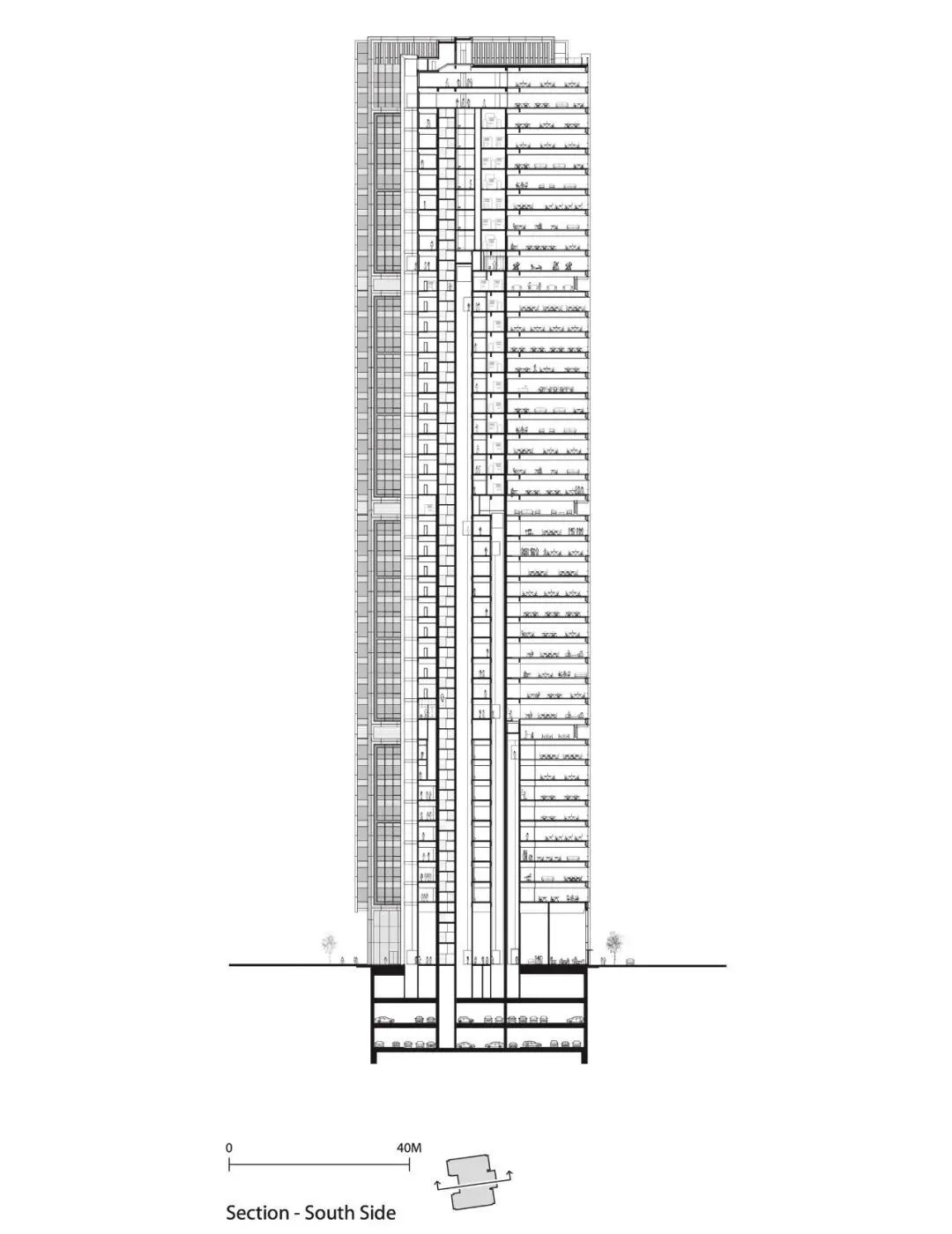 The column-free, flexible office floorplates have been designed to suit a variety of layouts, from single to multiple tenancies. Every level has detachable floor slabs to allow for connections between them. Along the western façade, the middle section of the building is recessed to allow natural light to flood the office spaces with a row of scenic lifts located within this recess to maximize views of the park and river.