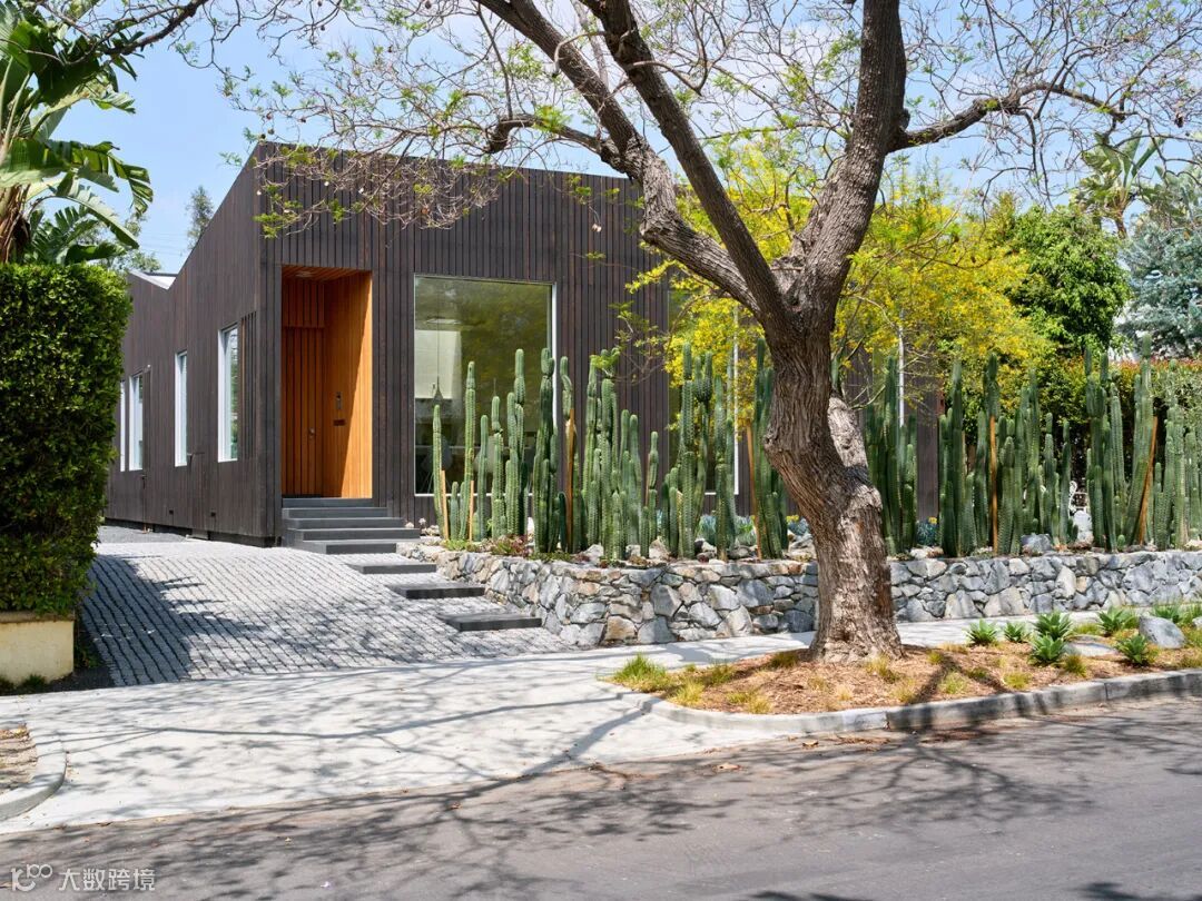 烧杉板外立面与绿色仙人掌形成对比 ©Brandon Shigeta
