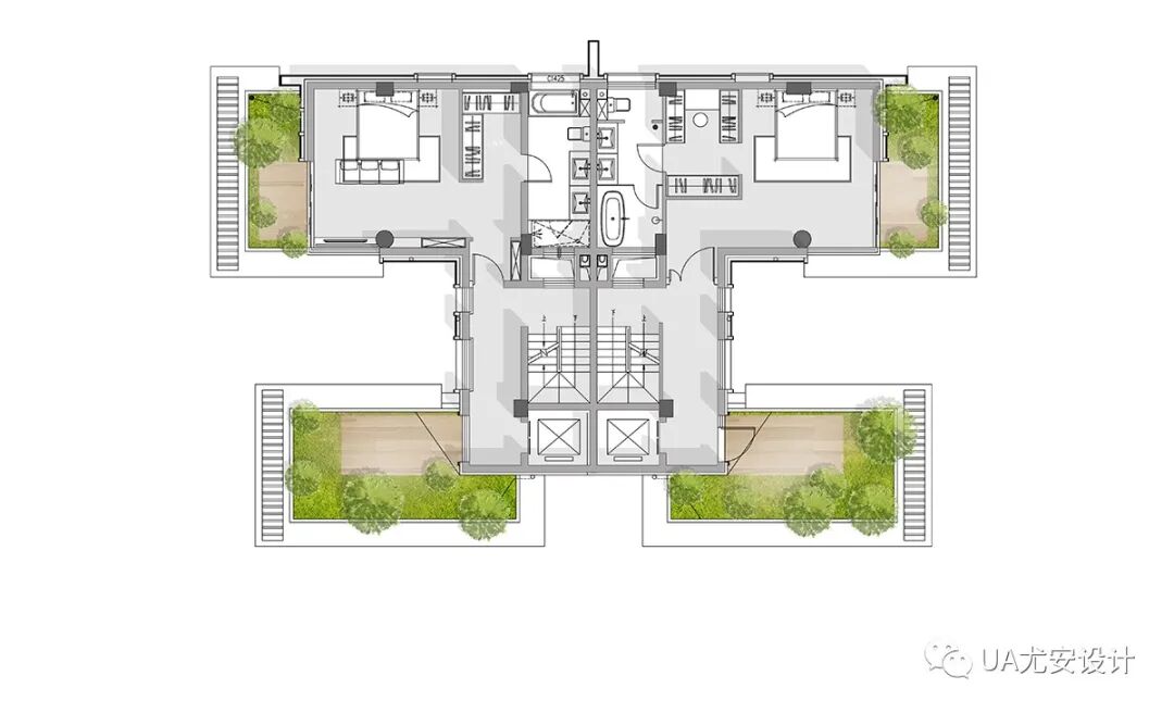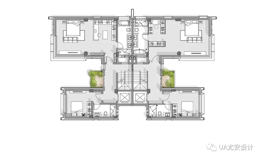 148户型产品中的院落层层分设,分别承担不同的秩序功能:“礼院”——提供独立天地的入户空间;“景院”——归并后勤动线;“雅院”——为卧室提供私密景观花园;“内院”——承担内部空间的过渡功能;“合院”——在顶层提供家庭共享的大花园。多重院落的设置,真正实现了层层有院,院院有序。