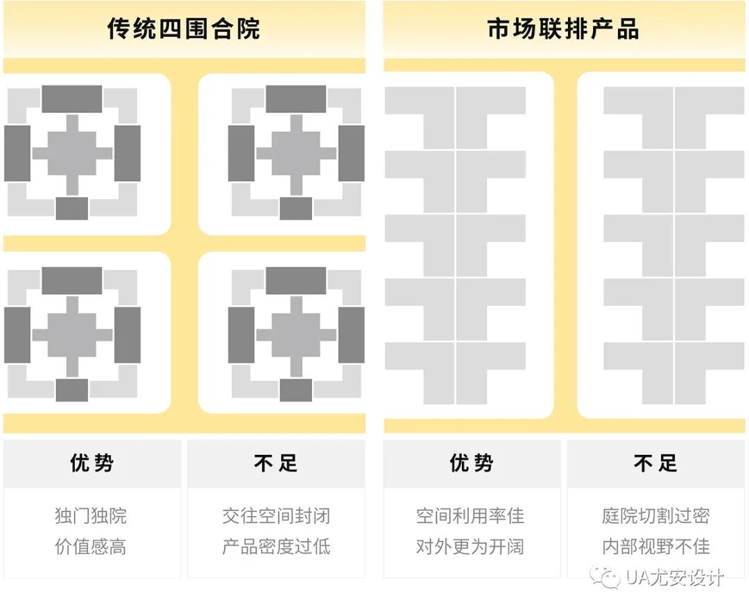 通过对传统四围合院与常见联排产品的研究,设计对大区总体的规划形式进行革新,项目结合中式合院独门独院的空间感受与联排产品良好的空间利用,对产品布局进行升级。规划以主街与次街分割出不同尺度的产品组团,通过不同产品的相互穿插,令社区在低密的空间前提下更具层次感与丰富性。