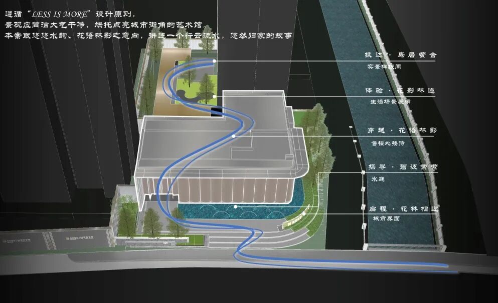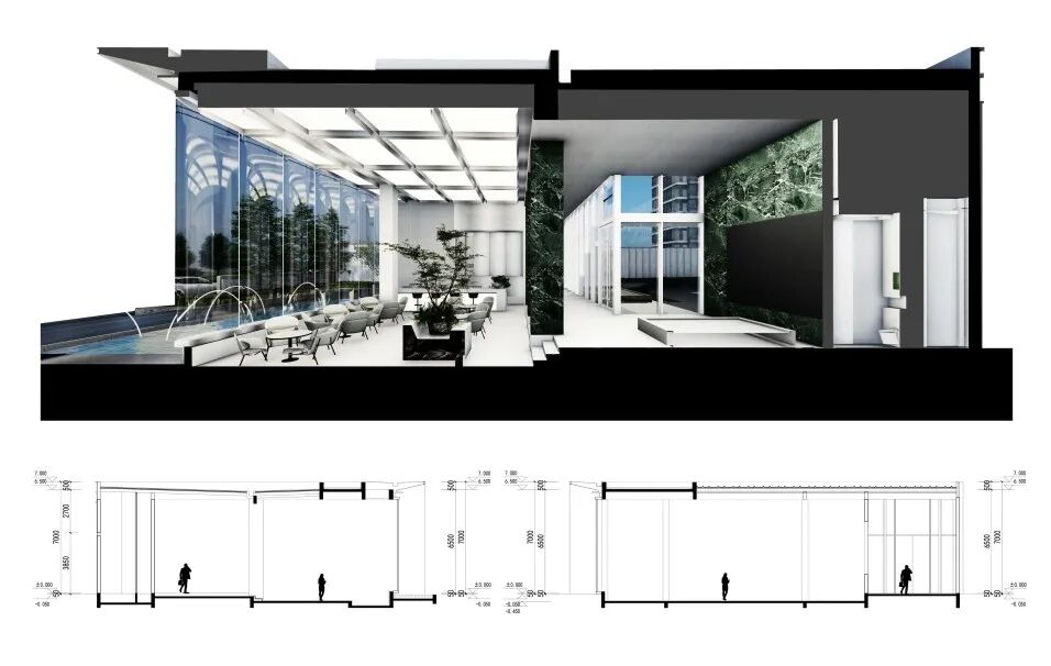 建筑以L形体量占据城市街角,尽可能扩大展示面。洽谈区位于景观最优处,室内局部下沉的处理手法,增强了空间限定感,也让洽谈区临水一侧更亲水。