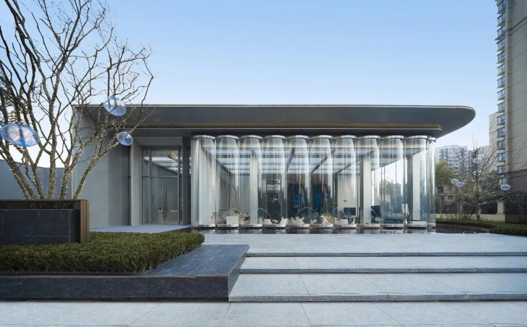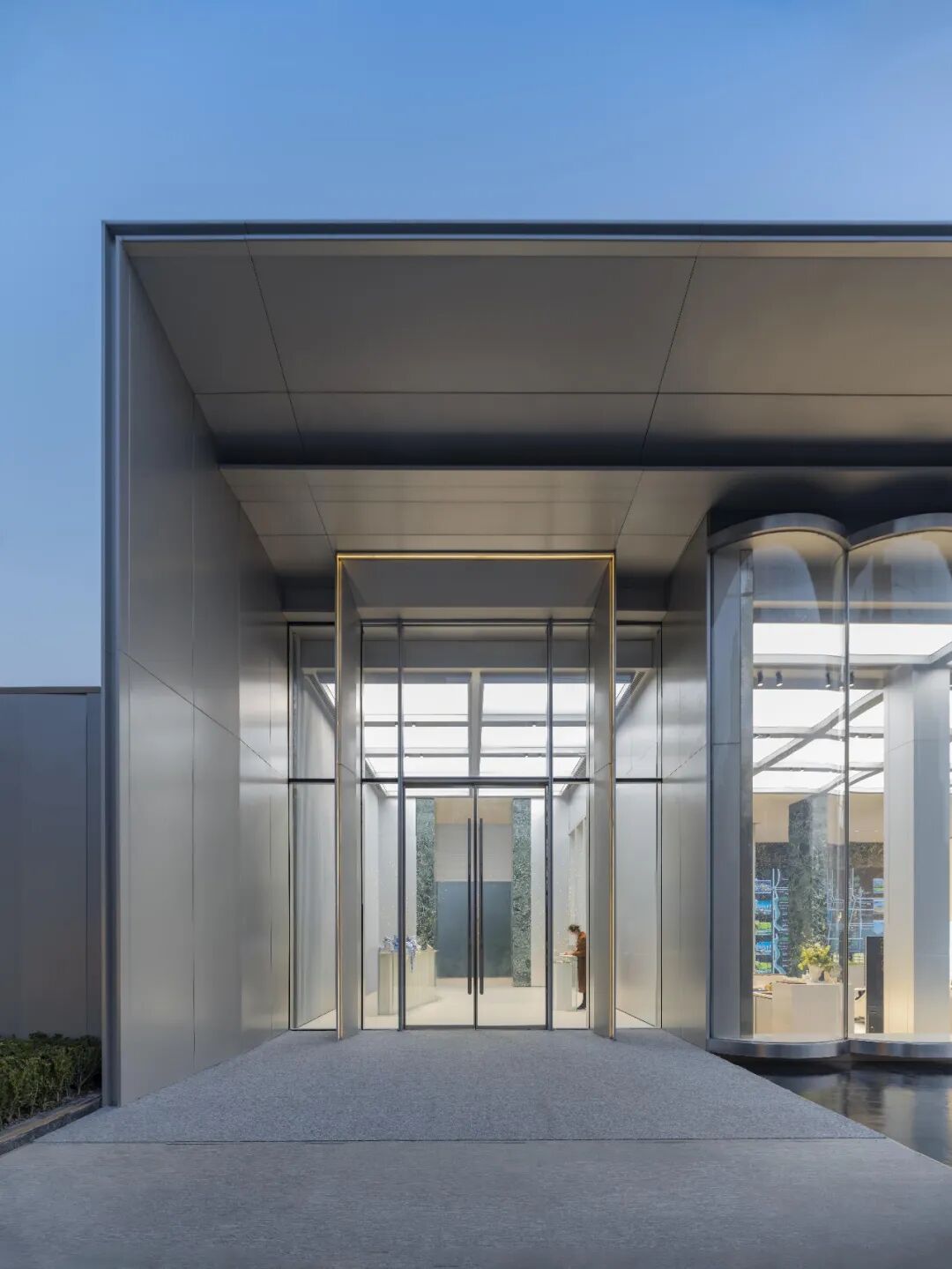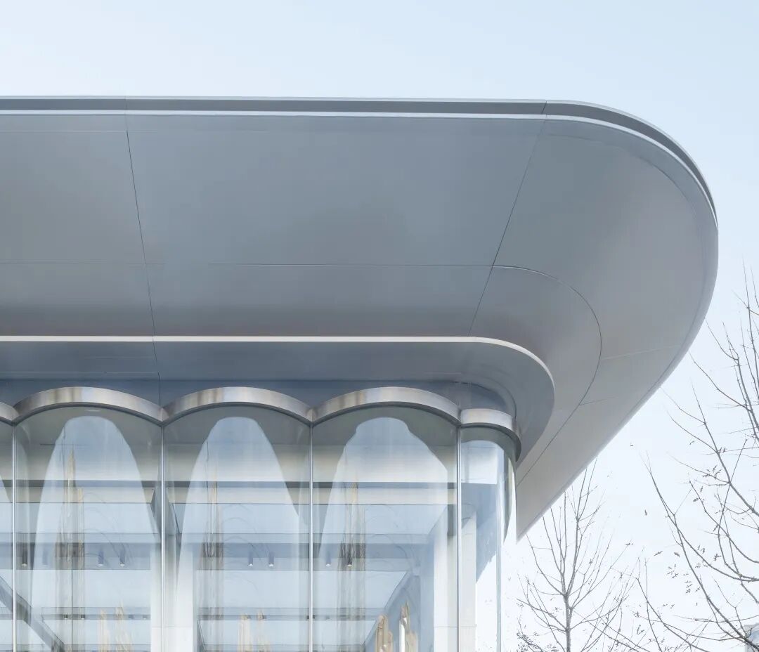 展示中心采用现代极简美学的风格,弧形的弯钢玻璃形成晶莹剔透的幕墙结合铝板飘顶,形态简洁大方而不失灵动。