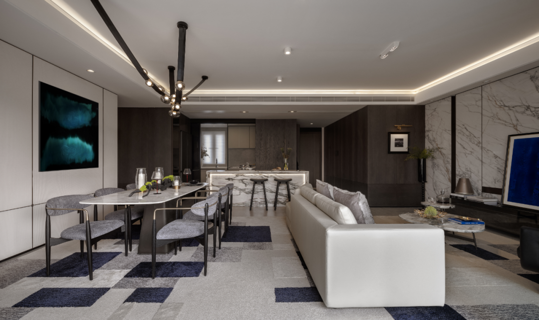 客餐厨空间设计,布局开放,洄游动线更符合业主对功能化和社交互动的双重需求,避免由隔断产生的空间逼仄感。通过开放式的空间设计,重新编排生活功能,提高家人间的互动性。