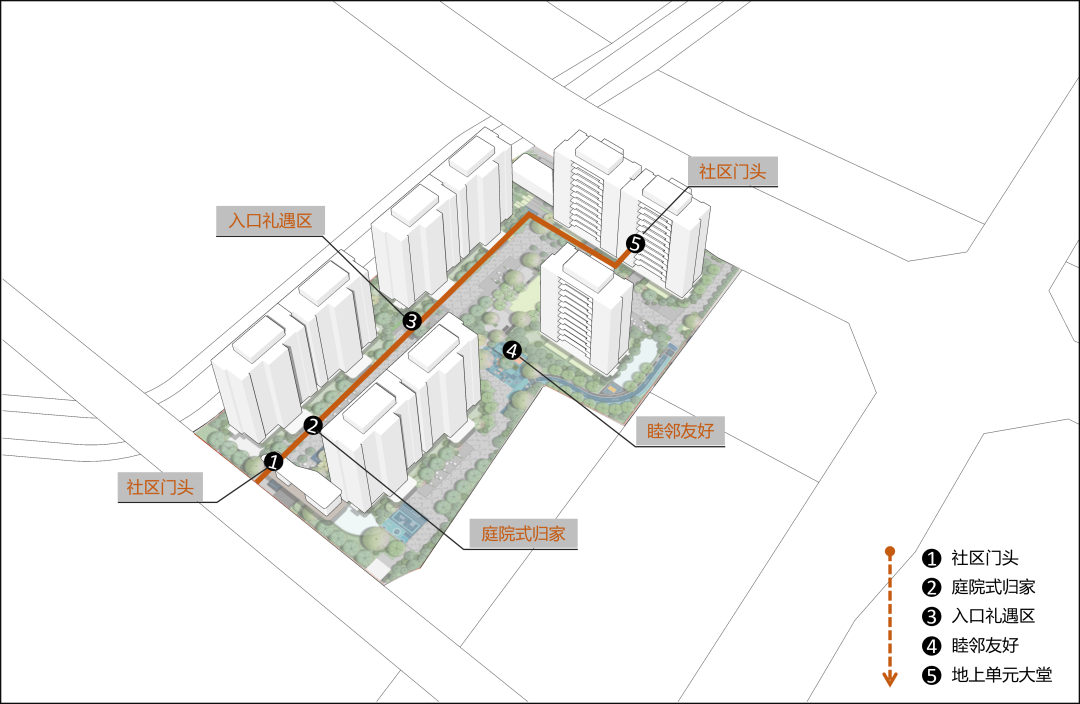 大堂的设计趋向于视线明朗,较少阻挡的方案,社区内部与城市之间隐隐有联系但是又隔断,入则宁静,出则繁华,延伸向城市公共空间。