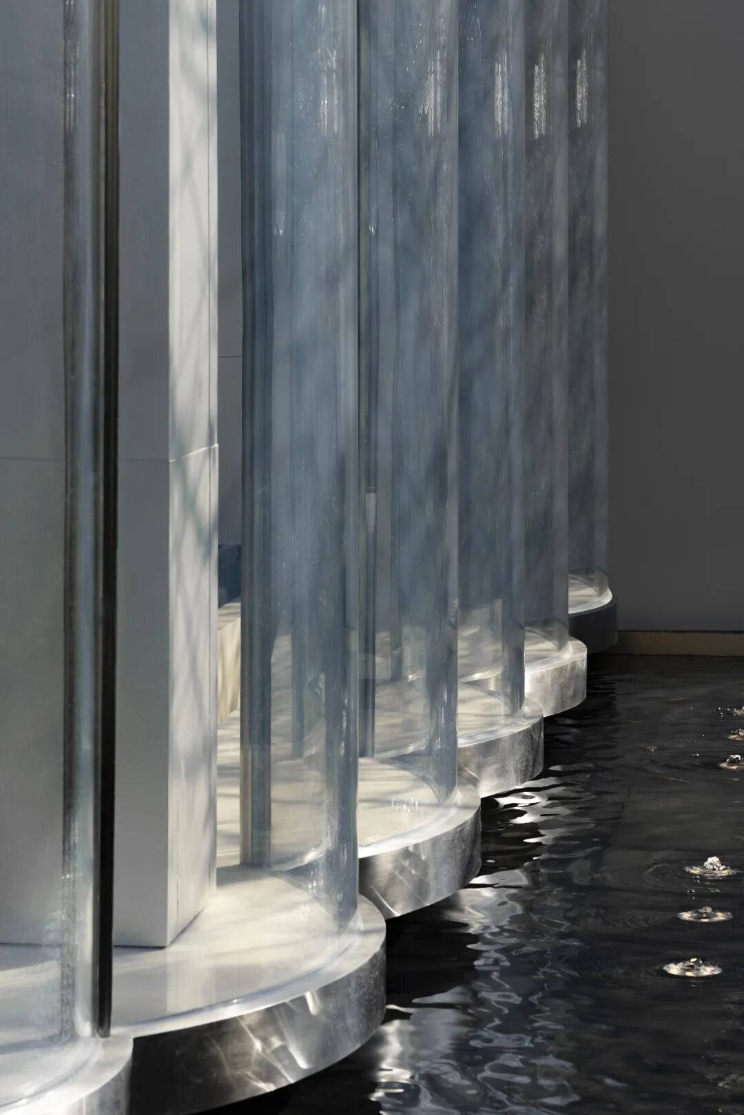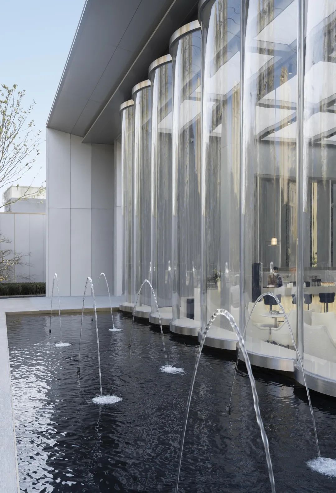 建筑前场萦萦碧波,水林相映成趣,增添建筑的漂浮感,而后到达城市会客厅共享空间,透过晶莹的弧形造型玻璃,映入眼帘的是花影林迹的唯美空间。