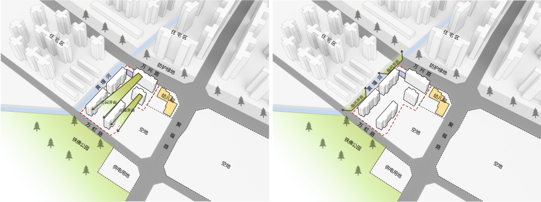 “丞相祠堂何处寻,锦官城外柏森森”,历史文化悠久。设计师从在地文脉的角度出发,参考中国传统院落式结构进行规划,但是楼栋之间距离过近会存在视线干扰,因此最终选择了一进院落——大庭院的布局形式,空间尺度开阔,南侧朝铁佛公园打开,从而使城市景观能够渗透。