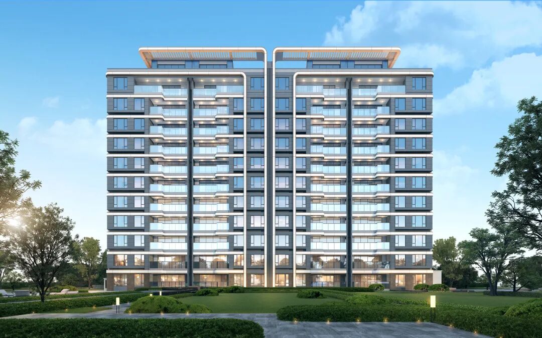 外立面设计上引用了藏山纳水的设计理念,传承东方艺术之美,框构中正,完成了古典美学的现代转译。形态上舍弃了住宅惯用的平直方正,采用弧形立面设计,将山的刚毅,与水的柔和完美演绎,刚柔并济,充满生命活力。