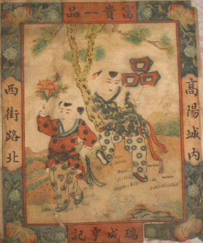 20世纪二三十年代,高阳县商家生产的布匹就曾以《红楼梦》人物作为广告宣传。时,农村土布生产少有固定商标和包装,遂在布匹表面放一张印有自家名号、地址的彩折。为引人注目,彩纸上还印有人物、花草,这种彩纸既是商标又兼为广告。图中即是高阳生产厂家印制名为“富贵一品”的土布彩纸宣传广告,画中印有“高阳城内,西街路北”字样,织布厂名号为“瑞成亨记”。推测可能是前店后厂之布匹作坊。彩纸中心图案即为《红楼梦》中人物。