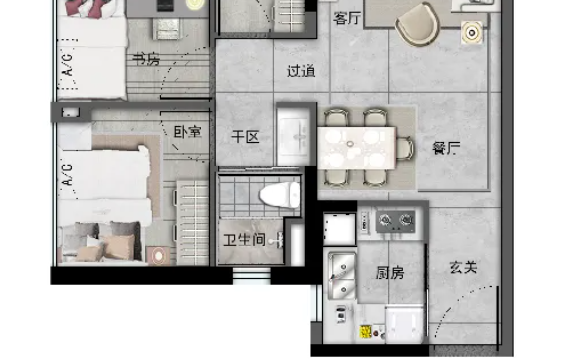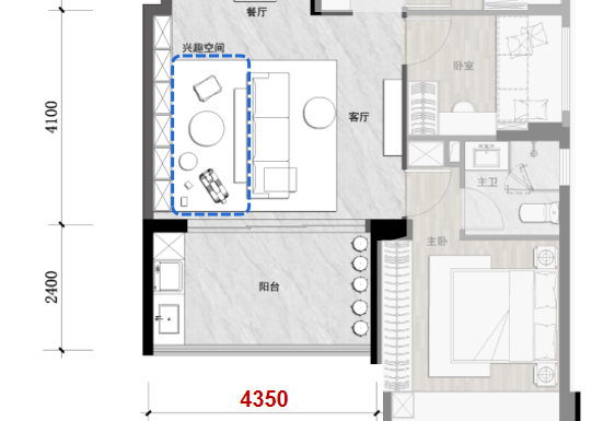 比如深圳万科都会四季花园约94㎡户型,客厅变家厅,约4.3m超广角竖厅设计,客厅变家厅,散点式家具布局和兴趣角落,营造出更多的家庭交互空间。