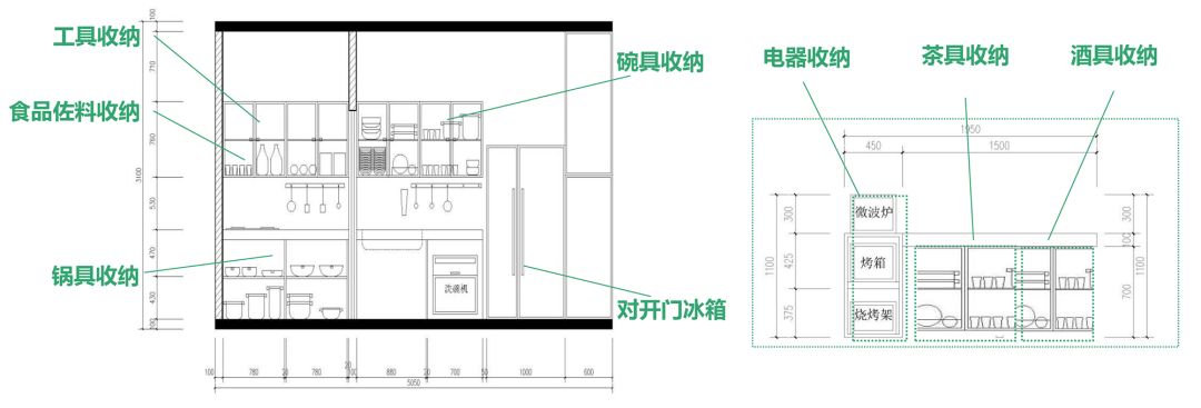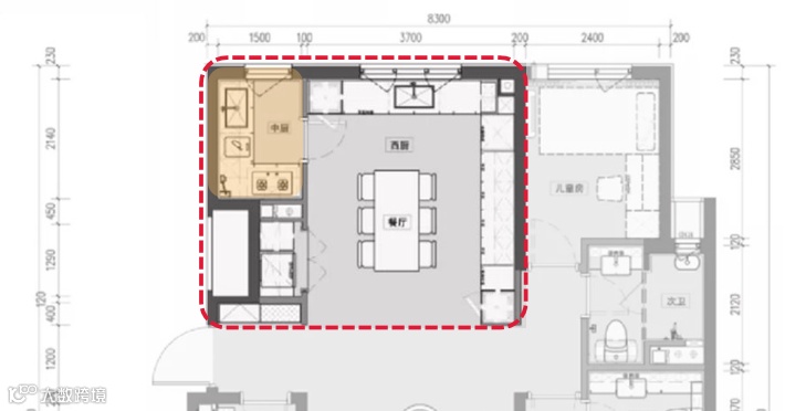 独立的区域就是集约洗切烹这三个工种,而对于厨房其他的冰箱、收纳、设备等功能,整体设计整体选择放在了餐厅的部分。