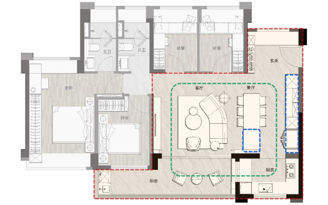 将传统上相对独立封闭的空间关联起来,生成功能多变的生活场景,以更多的空间容纳全家人互动。