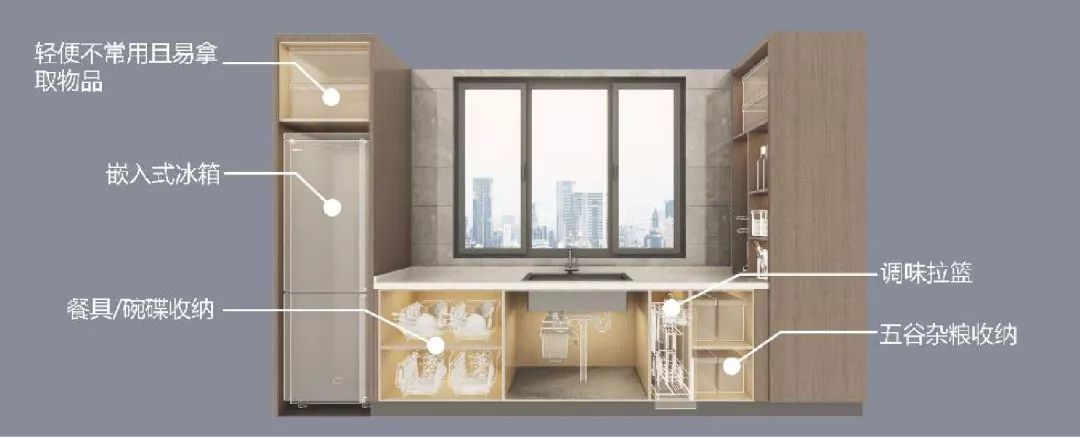 厨房设备日益复杂化、专业化,设备集成化也使得家电功能不断合并,占用空间减小,布置方式趋于合理,收纳集成化使收纳空间合理精确。