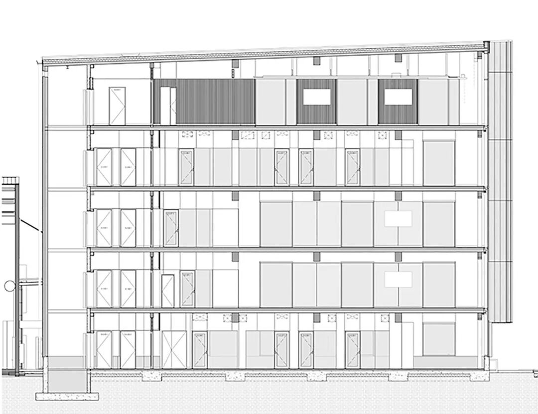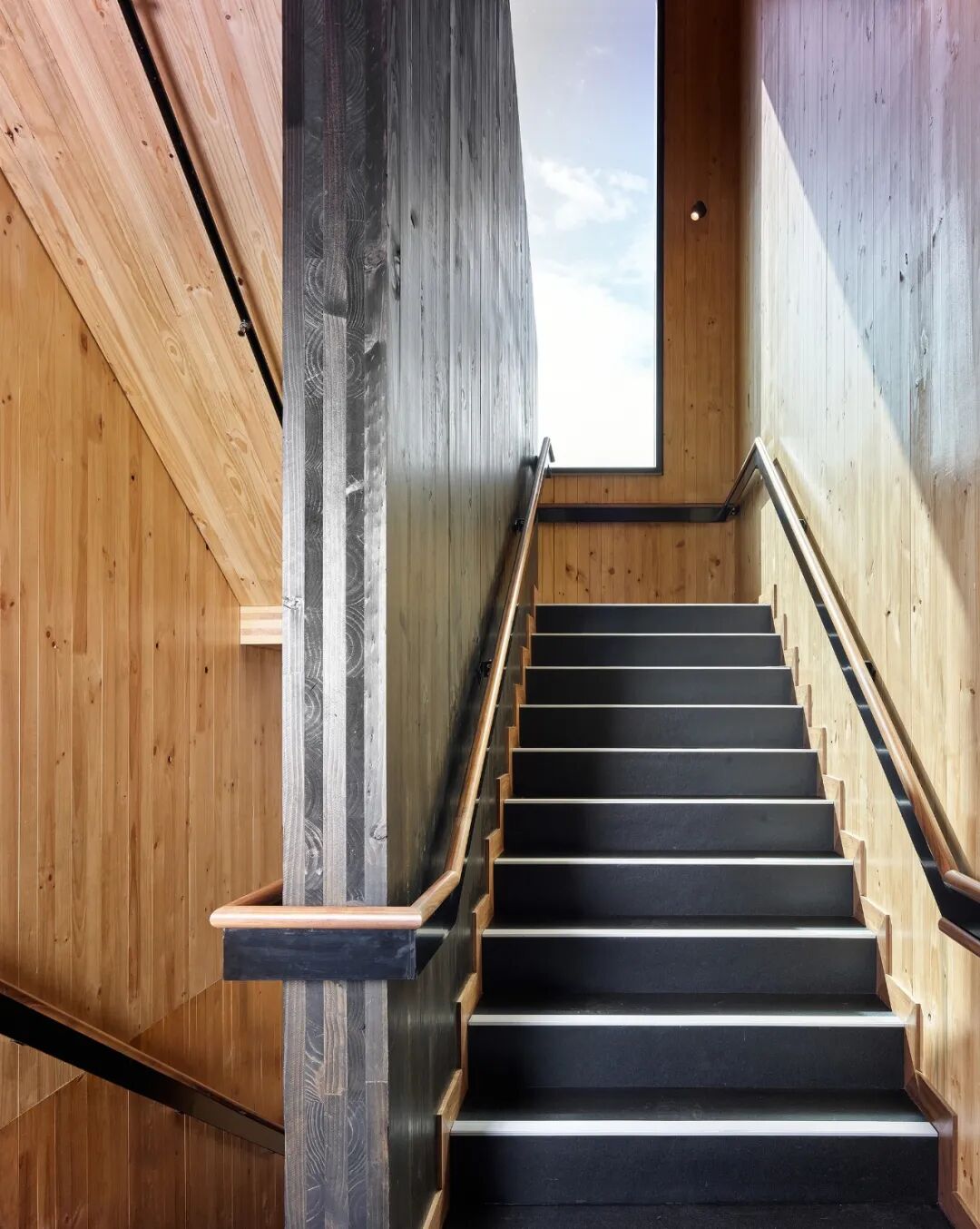 木材塔的开发是为了直接应对项目的挑战,即有限的建设时间、有限的场地、固定的楼层面积,以及一个具有国家意义的已被占用的运营场地的建设挑战。塔的形式占据了整个可用场地。结构和建筑系统的完全制造方法允许 "及时 "的施工装配。木板直接从运输车辆上吊起,采用原始结构作为主要的装饰,为空间提供了一个家庭品质。额外的(干贸易)墙体元素延续了预制木材元素的逻辑,如胶合板。