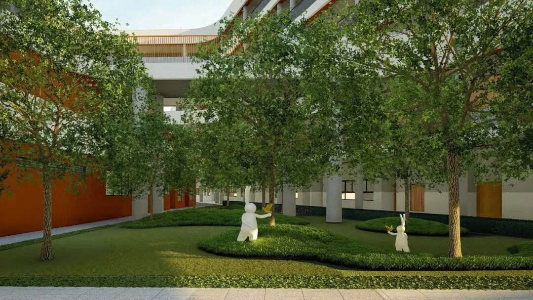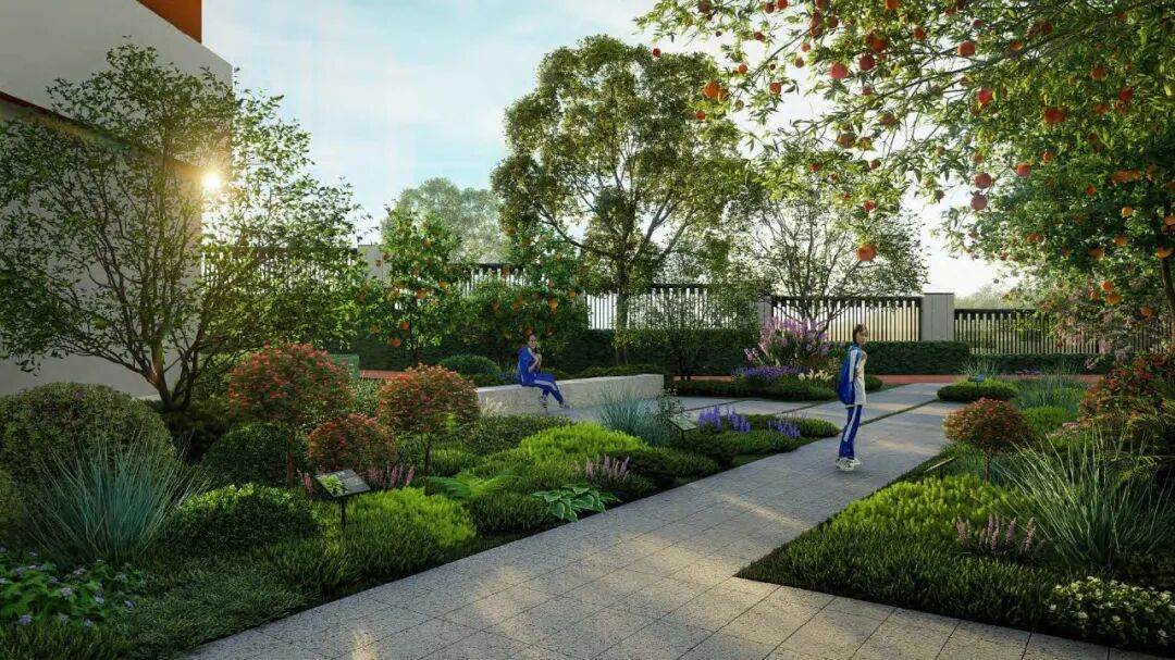 项目在规划中以“ 空间布局差异化+ 复合性空间”的思维,结合心理分析,打造既有公共活动空间,又有独立私密空间的校园景观,将空间分为逐风园、科普园、艺术园、漂浮园、励志园、书香园、趣味园等节点。设计延续建筑现代直线与楔形的形式, 使景观和建筑更整体,同时提取建筑色彩作为主打色, 保持空间色彩的干净整洁。